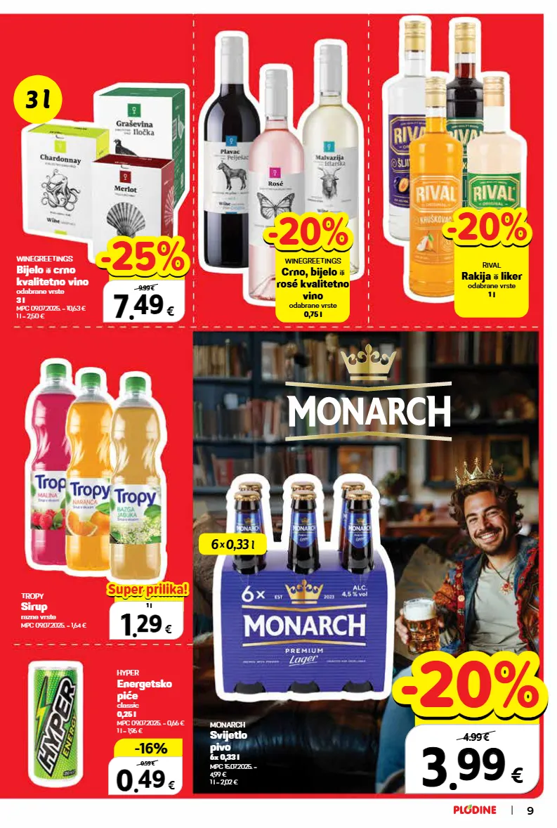 tropy sirup razne vrste mpc 09.07.2025. = 1,64 € hyper energetsko piće classic 0,25 l mpc 09.07.2025. = 0,66 € 1 l = 1,96 € monarch svijetlo pivo 6x 0,33 l mpc 15.07.2025. = 4,99 € 1 l = 2,02 € winegreetings crno, bijelo ili rosé kvalitetno vino odabrane vrste 0,75 l -20% -20% rival rakija ili liker odabrane vrste 1 l -20% -20% top cijena! već od hit cijena! 1 1 . . 29 29 € 1 l super prilika! super prilika! 0 0 . . 49 49 € xxxxx -16% -16% 0.59 € 7 7 . . 49 49 € xxxxx 9.99 € -25% -25% 3 3 . . 99 99 € xxxxx 4.99 € -20% -20% 6 x 0,33 l 3 l winegreetings bijelo ili crno kvalitetno vino odabrane vrste 3 l mpc 09.07.2025. = 10,63 € 1 l = 2,50 € 9