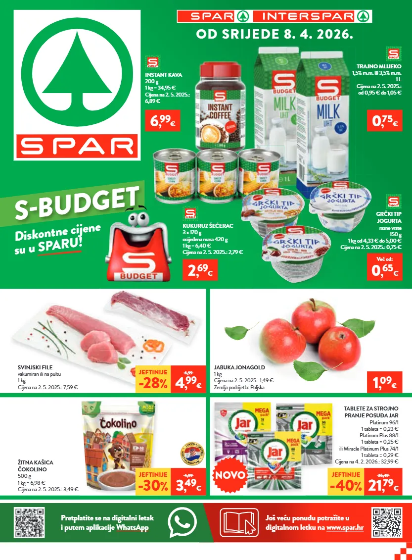 sbudget sbudget diskontne cijene su u sparu! još veću ponudu potražite u digitalnom letku na www.spar.hr pretplatite se na digitalni letak i putem aplikacije whatsapp svinjski file vakumiran ili na pultu 1 kg cijena na 2. 5. 2025.: 7,59 € žitna kašica čokolino 500 g 1 kg = 6,98 € cijena na 2. 5. 2025.: 3,49 € jabuka jonagold 1 kg cijena na 2. 5. 2025.: 1,49 € zemlja podrijetla: poljska tablete za strojno pranje posuđa jar platinum 96/1 1 tableta = 0,23 € platinum plus 88/1 1 tableta = 0,25 € ili miracle platinum plus 74/1 1 tableta = 0,29 € cijena na 4. 2. 2026.: 32,99 € kukuruz šećerac 3 x 170 g ocijeđena masa 420 g 1 kg = 6,40 € cijena na 2. 5. 2025.: 2,79 € trajno mlijeko 1,5% m.m. ili 3,5% m.m. 1 l cijena na 2. 5. 2025.: od 0,95 € do 1,05 € grčki tip jogurta razne vrste 150 g 1 kg od 4,33 € do 5,00 € cijena na 2. 5. 2025.: 0,75 € instant kava 200 g 1 kg = 34,95 € cijena na 2. 5. 2025.: 6,89 € 1 , 09 € jeftinije -40 % 36,49 21 , 79 € jeftinije -28 % 6,99 4 , 99 € jeftinije -30 % 4,99 3 , 49 € već od: 0 , 65 € novo 2 , 69 € 6 , 99 € 0 , 75 € od srijede 8. 4. 2026.