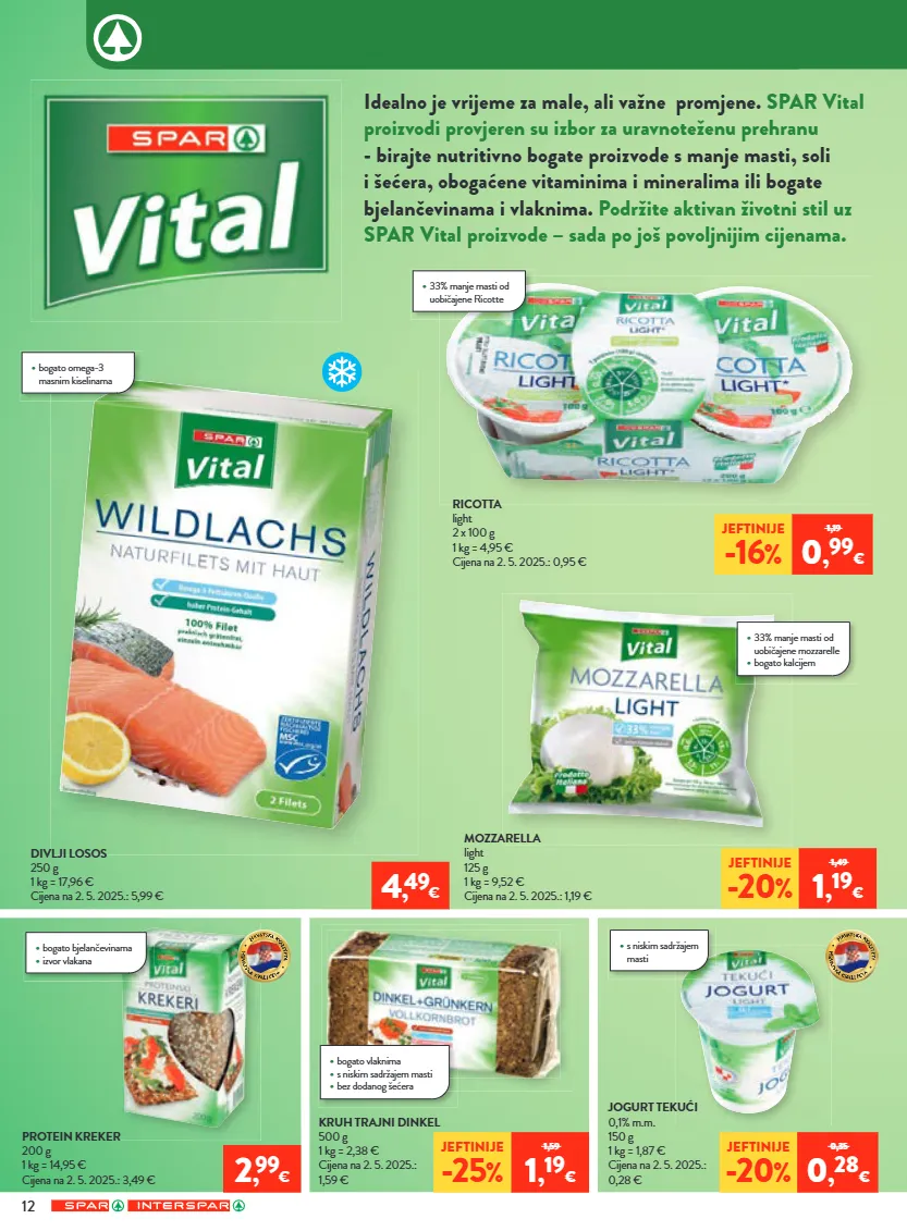 idealno je vrijeme za male, ali važne promjene. spar vital proizvodi provjeren su izbor za uravnoteženu prehranu - birajte nutritivno bogate proizvode s manje masti, soli i šećera, obogaćene vitaminima i mineralima ili bogate bjelančevinama i vlaknima. podržite aktivan životni stil uz spar vital proizvode – sada po još povoljnijim cijenama. za vitalan početak 12 protein kreker 200 g 1 kg = 14,95 € cijena na 2. 5. 2025.: 3,49 € divlji losos 250 g 1 kg = 17,96 € cijena na 2. 5. 2025.: 5,99 € jogurt tekući 0,1% m.m. 150 g 1 kg = 1,87 € cijena na 2. 5. 2025.: 0,28 € ricotta light 2 x 100 g 1 kg = 4,95 € cijena na 2. 5. 2025.: 0,95 € kruh trajni dinkel 500 g 1 kg = 2,38 € cijena na 2. 5. 2025.: 1,59 € mozzarella light 125 g 1 kg = 9,52 € cijena na 2. 5. 2025.: 1,19 € 4 , 49 € 2 , 99 € jeftinije -20 % 1,49 1 , 19 € jeftinije -25 % 1,59 1 , 19 € jeftinije -16 % 1,19 0 , 99 € jeftinije -20 % 0,35 0 , 28 € • s niskim sadržajem masti • 33% manje masti od uobičajene ricotte • bogato omega-3 masnim kiselinama • 33% manje masti od uobičajene mozzarelle • bogato kalcijem • bogato bjelančevinama • izvor vlakana • bogato vlaknima • s niskim sadržajem masti • bez dodanog šećera