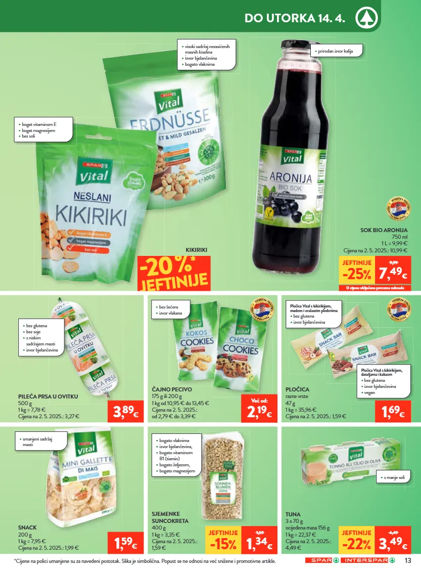 *cijene na polici umanjene su za navedeni postotak. slika je simbolična. popust se ne odnosi na već snižene i promotivne artikle. 13 pileća prsa u ovitku 500 g 1 kg = 7,78 € cijena na 2. 5. 2025.: 3,27 € snack 200 g 1 kg = 7,95 € cijena na 2. 5. 2025.: 1,99 € čajno pecivo 175 g ili 200 g 1 kg od 10,95 € do 13,45 € cijena na 2. 5. 2025.: od 2,79 € do 3,39 € sjemenke suncokreta 400 g 1 kg = 3,35 € cijena na 2. 5. 2025.: 1,59 € pločica razne vrste 47 g 1 kg = 35,96 € cijena na 2. 5. 2025.: 1,59 € sok bio aronija 750 ml 1 l = 9,99 € cijena na 2. 5. 2025.: 10,99 € kikiriki tuna 3 x 70 g ocijeđena masa 156 g 1 kg = 22,37 € cijena na 2. 5. 2025.: 4,49 € 3 , 89 € 1 , 59 € 1 , 69 € jeftinije -15 % 1,59 1 , 34 € jeftinije -22 % 4,49 3 , 49 € 20% * jeftinije jeftinije -25 % 9,99 7 , 49 € u cijenu uključena povratna naknada već od: 2 , 19 € • smanjeni sadržaj masti • visoki sadržaj nezasićenih masnih kiselina • i zvor bjelančevina • bogato vlaknima • bogat vitaminom e • bogat magnezijem • bez soli • prirodan izvor kalija • bogato vlaknima • izvor bjelančevina, • bogato vitaminom b1 (tiamin) • bogato željezom, • bogato magnezijem • s manje soli pločica vital s kikirikijem, medom i orašastim plodovima • bez glutena • izvor bjelančevina pločica vital s kikirikijem, datuljama i kakaom • bez glutena • izvor bjelančevina • vegan • bez šećera • izvor vlakana • bez glutena • bez soje • s niskim sadržajem masti • izvor bjelančevina do utorka 14. 4.