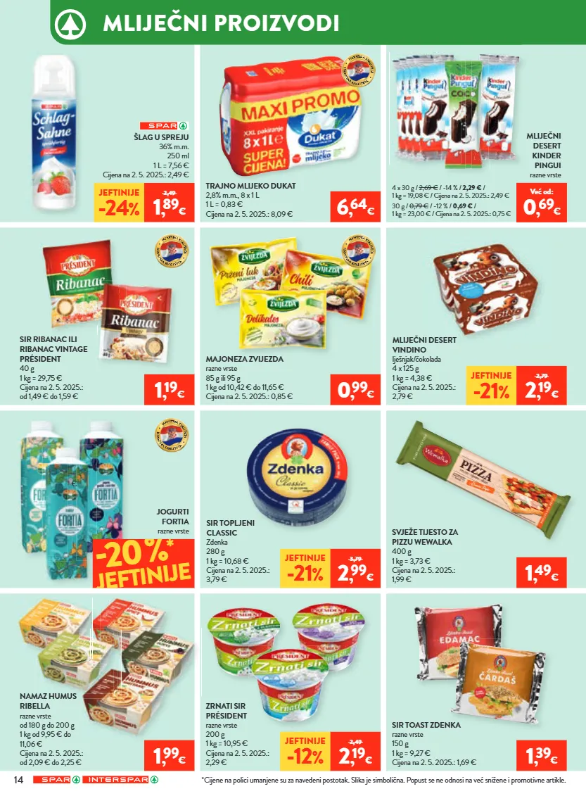 14 *cijene na polici umanjene su za navedeni postotak. slika je simbolična. popust se ne odnosi na već snižene i promotivne artikle. trajno mlijeko dukat 2,8% m.m., 8 x 1 l 1 l = 0,83 € cijena na 2. 5. 2025.: 8,09 € mliječni desert kinder pingui razne vrste šlag u spreju 36% m.m. 250 ml 1 l = 7,56 € cijena na 2. 5. 2025.: 2,49 € sir ribanac ili ribanac vintage président 40 g 1 kg = 29,75 € cijena na 2. 5. 2025.: od 1,49 € do 1,59 € mliječni desert vindino lješnjak/čokolada 4 x 125 g 1 kg = 4,38 € cijena na 2. 5. 2025.: 2,79 € sir topljeni classic zdenka 280 g 1 kg = 10,68 € cijena na 2. 5. 2025.: 3,79 € namaz humus ribella razne vrste od 180 g do 200 g 1 kg od 9,95 € do 11,06 € cijena na 2. 5. 2025.: od 2,09 € do 2,25 € zrnati sir président razne vrste 200 g 1 kg = 10,95 € cijena na 2. 5. 2025.: 2,29 € svježe tijesto za pizzu wewalka 400 g 1 kg = 3,73 € cijena na 2. 5. 2025.: 1,99 € majoneza zvijezda razne vrste 85 g ili 95 g 1 kg od 10,42 € do 11,65 € cijena na 2. 5. 2025.: 0,85 € sir toast zdenka razne vrste 150 g 1 kg = 9,27 € cijena na 2. 5. 2025.: 1,69 € jeftinije -24 % 2,49 1 , 89 € jeftinije -21 % 2,79 2 , 19 € jeftinije -21 % 3,79 2 , 99 € jeftinije -12 % 2,49 2 , 19 € 0 , 99 € 6 , 64 € 1 , 19 € 1 , 49 € 1 , 39 € 1 , 99 € jogurti fortia razne vrste 20% * jeftinije već od: 0 , 69 € 4 x 30 g / 2,69 € / -14 % / 2,29 € / 1 kg = 19,08 € / cijena na 2. 5. 2025.: 2,49 € 30 g / 0,79 € / -12 % / 0,69 € / 1 kg = 23,00 € / cijena na 2. 5. 2025.: 0,75 € € mliječni proizvodi do utorka 14. 4.