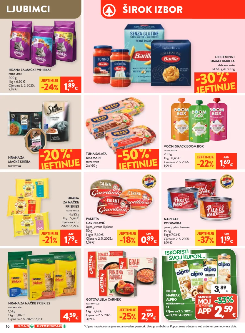 16 3 , 89 € , samo uz 2 , 59 € -33% iskoristi svoj kupon... *cijene na polici umanjene su za navedeni postotak. slika je simbolična. popust se ne odnosi na već snižene i promotivne artikle. 4 , 59 € tuna salata rio mare razne vrste 2 x 160 g voćni snack boom box razne vrste 200 g 1 kg = 8,45 € cijena na 2. 5. 2025.: 1,99 € narezak podravka pureći, pileći ili mesni 150 g 1 kg = 7,93 € cijena na 2. 5. 2025.: 1,99 € pašteta gavrilović čajna, jetrena ili pikant 50 g 1 kg = 17,80 € cijena na 2. 5. 2025.: 1,09 € gotova jela carnex razne vrste 400 g 1 kg = 7,48 € cijena na 2. 5. 2025.: 3,69 € hrana za mačke whiskas razne vrste 300 g 1 kg = 6,30 € cijena na 2. 5. 2025.: 2,39 € hrana za mačke sheba razne vrste tjestenina i umaci barilla odabrane vrste od 190 g do 500 g hrana za mačke friskies razne vrste 4 x 85 g 1 kg = 5,26 € cijena na 2. 5. 2025.: 2,29 € hrana za mačke friskies razne vrste 1,5 kg 1 kg = 3,06 € cijena na 2. 5. 2025.: 7,16 € biljni napitak alpro odabrane vrste 1 l cijena na 2. 5. 2025.: od 3,79 € do 3,99 € jeftinije -22 % 2,19 1 , 69 € jeftinije -37 % 1,89 1 , 19 € jeftinije -18 % 1,09 0 , 89 € jeftinije -25 % 3,99 2 , 99 € jeftinije -24 % 2,49 1 , 89 € jeftinije -21 % 2,29 1 , 79 € 20% * jeftinije 50% * jeftinije 30% * jeftinije hrana za mačke friskies ljubimci širok izbor