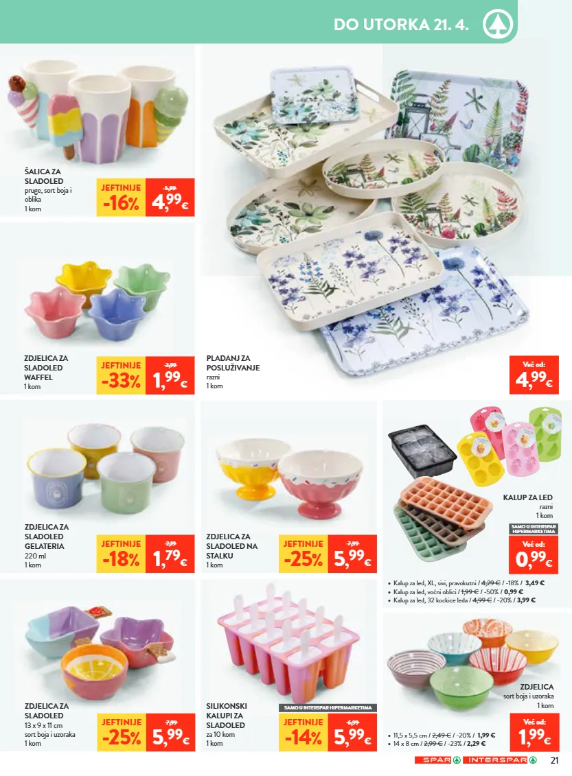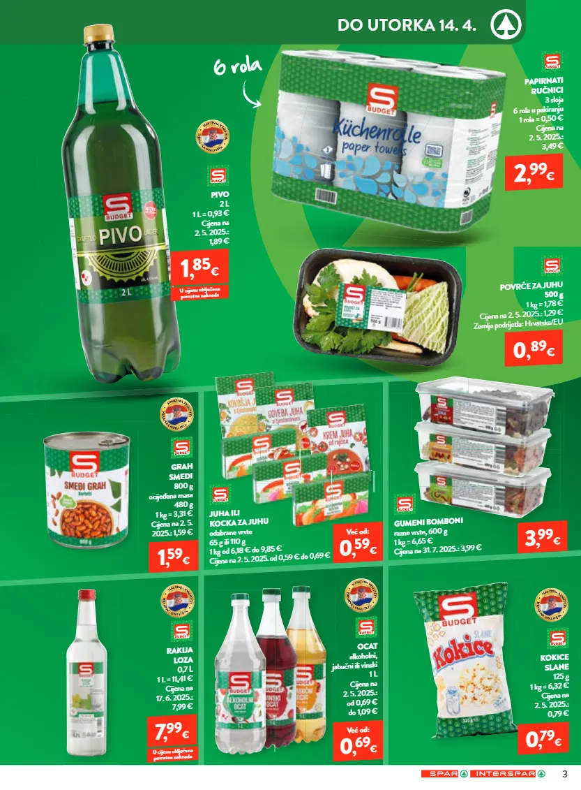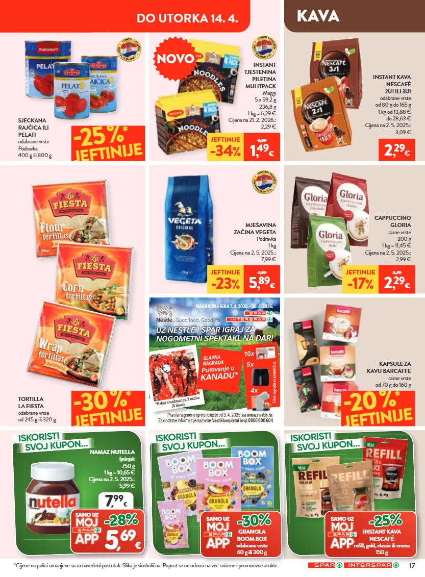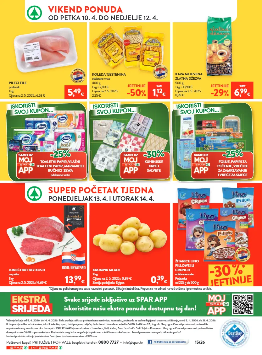 važenje letka je od 8. 4. 2026. do 14. 4. 2026. ili do prodaje zaliha za prehrambene namirnice, kozmetiku, proizvode za osobnu higijenu i sredstva za čišćenje, te od 8. 4. 2026. do 21. 4. 2026. ili do prodaje zaliha za kućanstvo, tekstil, tehniku, sport, hobi program, cvijeće, školu i ured. ponuda ne vrijedi u spar jurišićeva 2a, zagreb. zbog ograničenosti prostora svi proizvodi iz neprehrambenog asortimana nisu dostupni u interspar hipermarketima u samoboru, puli, zadru, ante starčevića 5a i osijek - portanova. zbog ograničenosti prostora svi proizvodi nisu dostupni u svim spar supermarketima. proizvode iz ovog letka moguće je kupiti samo u količinama za kućanstvo. ne odgovaramo za moguće tiskarske greške! izraženi postotak sniženja je minimalan. sve cijene izražene su u eurima s pdv-om. poštovani kupci! pritužbe i pohvale besplatni telefon 0800 7727 – info@spar.hr 15/26 *cijene na polici umanjene su za navedeni postotak. slika je simbolična. popust se ne odnosi na već snižene i promotivne artikle. svake srijede isključivo uz spar app iskoristite našu ekstra ponudu dostupnu taj dan! ekstra srijeda pileći file podložak 1 kg cijena na 2. 5. 2025.: 6,63 € koleda tjestenina odabrane vrste 400 g 1 kg = 2,80 € cijena na 2. 5. 2025.: 2,25 € juneći but bez kosti na pultu 1 kg cijena na 2. 5. 2025.: 14,69 € krumpir mladi 1 kg cijena na 2. 5. 2025.: 0,89 € zemlja podrijetla: egipat kava mljevena zlatna džezva 500 g 1 kg = 13,98 € cijena na 2. 5. 2025.: 8,99 € žitarice lino pillows ili crunch odabrane vrste podravka od 225 g do 500 g jeftinije -29 % 9,89 6 , 99 € 5 , 49 € 13 , 99 € 0 , 39 € 30% * jeftinije juneći but bez kosti jeftinije -50 % 2,25 1 , 12 € super početak tjedna ponedjeljak 13. 4. i utorak 14. 4. vikend ponuda od petka 10. 4. do nedjelje 12. 4. iskoristi svoj kupon... iskoristi svoj kupon... iskoristi svoj kupon... samo uz -30% kuhinjske krpe i salvete samo uz -25% toaletni papir, vlažni toaletni papir, maramice i ručnici zewa odabrane vrste samo uz -25% folije, papiri za pečenje, vrećice za zamrzavanje i vreće za smeće 100% hrvatsko