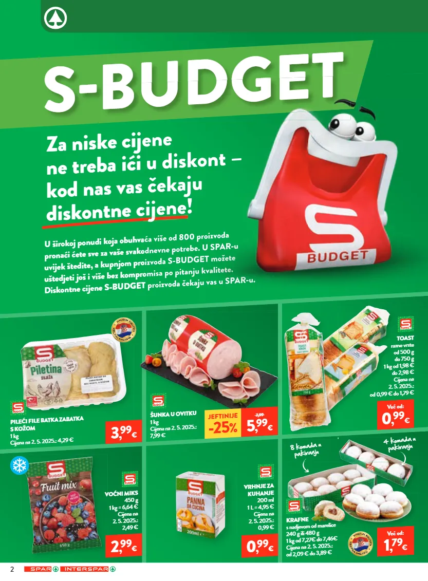 sbudget za niske cijene ne treba ići u diskont – kod nas vas čekaju diskontne cijene! u širokoj ponudi koja obuhvaća više od 800 proizvoda pronaći ćete sve za vaše svakodnevne potrebe. u spar-u uvijek štedite, a kupnjom proizvoda s-budget možete uštedjeti još i više bez kompromisa po pitanju kvalitete. diskontne cijene s-budget proizvoda čekaju vas u spar-u. sbudget sbudget za niske cijene ne treba ići u diskont – kod nas vas čekaju diskontne cijene! diskontne cijene! u širokoj ponudi koja obuhvaća više od 800 proizvoda pronaći ćete sve za vaše svakodnevne potrebe. u spar-u uvijek štedite, a kupnjom proizvoda s-budget možete uštedjeti još i više bez kompromisa po pitanju kvalitete. diskontne cijene s-budget proizvoda čekaju vas u spar-u. jeftinije -25 % 7,99 5 , 99 € već od: 1 , 79 € već od: 0 , 99 € krafne s nadjevom od marelice 240 g ili 480 g 1 kg od 7,27€ do 7,46€ cijena na 2. 5. 2025.: od 2,09 € do 3,89 € voćni miks 450 g 1 kg = 6,64 € cijena na 2. 5. 2025.: 2,49 € 3 , 99 € 2 , 99 € vrhnje za kuhanje 200 ml 1 l = 4,95 € cijena na 2. 5. 2025.: 0,99 € 0 , 99 € pileći file batka zabatka s kožom 1 kg cijena na 2. 5. 2025.: 4,29 € šunka u ovitku 1 kg cijena na 2. 5. 2025.: 7,99 € toast razne vrste od 500 g do 750 g 1 kg od 1,98 € do 2,98 € cijena na 2. 5. 2025.: od 0,99 € do 1,79 € 8 komada u pakiranju 4 komada u pakiranju 2