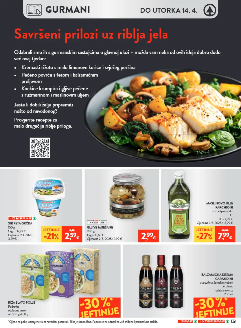 *cijene na polici umanjene su za navedeni postotak. slika je simbolična. popust se ne odnosi na već snižene i promotivne artikle. savršeni prilozi uz riblja jela odabrali smo ih s gurmanskim sastojcima u glavnoj ulozi – možda vam neka od ovih ideja dobro dođe već ovaj tjedan: • kremasti rižoto s malo limunove korice i svježeg peršina • pečeno povrće s fetom i balzamičnim preljevom • kockice krumpira i gljive pečene s ružmarinom i maslinovim uljem jeste li dobili želju pripremiti nešto od navedenog? provjerite recepte za malo drugačije riblje priloge. do utorka 14. 4. gurmani gljive miješane 280 g 1 kg = 10,68 € cijena na 2. 5. 2025.: 3,99 € balzamična krema carandini s tartufima, šumskim voćem ili classic odabrane vrste 250 ml maslinovo ulje farchioni extra djevičansko 1 l 1 l = 7,99 € cijena na 2. 5. 2025.: 13,99 € riža zlato polje podravka odabrane vrste od 500 g do 1 kg sir feta grčka 150 g 1 kg = 17,27 € cijena na 9. 1. 2026.: 3,29 € jeftinije -27 % 10,99 7 , 99 € jeftinije -21 % 3,29 2 , 59 € 30% * jeftinije 30% * jeftinije 2 , 99 €