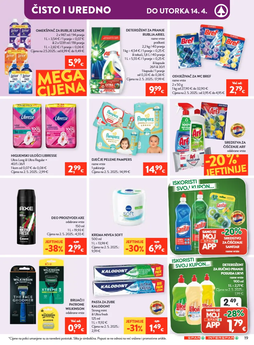 iskoristi svoj kupon... svoj kupon... svoj kupon... svoj kupon... svoj kupon... čisto i uredno do utorka 14. 4. higijenski ulošci libresse ultra long ili ultra regular + 40/1 i 36/1 1 kom od 0,07 € do 0,08 € cijena na 2. 5. 2025.: 2,99 € deo proizvodi axe odabrane vrste 150 ml 1 l = 19,93 € cijena na 2. 5. 2025.: 4,55 € omekšivač za rublje lenor 2 x 987 ml / 94 pranja 1 l = 3,54 € / 1 pranje = 0,07 € ili 2 x 1239 ml / 118 pranja 1 l = 2,82 € / 1 pranje = 0,06 € cijena na 2.5.2025.: od 8,99 € do 9,49 € deterdžent za pranje rublja ariel razne vrste praškasti 2,2 kg / 40 pranja 1 kg = 4,54 € / 1 pranje = 0,25 € ili tekući, 1,8 l / 40 pranja 1 l = 5,55 € / 1 pranje = 0,25 € ili kapsule 26/1 ili 30/1 1 kapsula / 1 pranje od 0,33 € do 0,38 € cijena na 2. 5. 2025.: 17,99 € krema nivea soft 500 ml 1 l = 13,98 € cijena na 2. 5. 2025.: 9,99 € pasta za zube kalodont strong mint ili ultra fresh 125 ml 1 l = 11,92 € cijena na 2. 5. 2025.: 2,19 € brijači i patrone wilkinson odabrane vrste sredstva za čišćenje arf odabrane vrste dječje pelene pampers razne vrste 1 pakiranje cijena na 2. 5. 2025.: 14,99 € osvježivač za wc bref razne vrste 2 x 50 g 1 kg od 27,90 € do 32,90 € cijena na 2. 5. 2025.: od 3,95 € do 4,95 € deterdžent za ručno pranje posuđa likvi razne vrste 900 ml 1 l = 2,77 € cijena na 2. 5. 2025.: 1,99 € 20% * jeftinije iskoristi svoj kupon... cijena na 2. 5. 2025.: 1,99 € 2 , 49 € , samo uz 1 , 79 € -28% jeftinije -30 % 9,99 6 , 99 € jeftinije -31 % 2,19 1 , 49 € jeftinije -38 % 4,89 2 , 99 € 2 , 99 € već od: 2 , 79 € 14 , 99 € 9 , 99 € 5 , 99 € samo uz -20% sredstvo za čišćenje sanitar razne vrste već od: 0 , 99 € 19 *cijene na polici umanjene su za navedeni postotak. slika je simbolična. popust se ne odnosi na već snižene i promotivne artikle. mega cijena