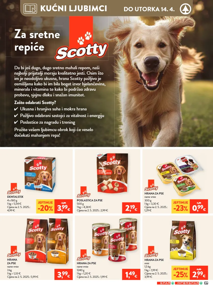 za sretne repiće da bi još dugo, dugo sretno mahali repom, naši najbolji prijatelji moraju kvalitetno jesti. osim što im je neodoljivo ukusna, hrana scotty pažljivo je osmišljena kako bi im bila bogat izvor bjelančevina, minerala i vitamina te kako bi podržao zdravu probavu, sjajnu dlaku i snažan imunitet. zašto odabrati scotty? ukusna i hranjiva suha i mokra hrana pažljivo odabrani sastojci za vitalnost i energiju poslastice za nagradu i trening pružite vašem ljubimcu obrok koji će veselo dočekati mahanjem repa! poslastica za pse 500 g 1 kg = 4,38 € cijena na 2. 5. 2025.: 2,99 € hrana za pse razne vrste 1240 g 1 kg = 1,20 € cijena na 2. 5. 2025.: 1,99 € hrana za pse razne vrste 300 g 1 kg = 3,30 € cijena na 2. 5. 2025.: 1,29 € hrana za pse mini 1,5 kg 1 kg = 1,99 € cijena na 2. 5. 2025.: 3,99 € dentalstix 4 x 180 g 1 kg = 5,54 € cijena na 2. 5. 2025.: 4,99 € hrana za pse razne vrste 3 kg 1 kg = 1,33 € cijena na 2. 5. 2025.: 5,99 € jeftinije -25 % 3,99 2 , 99 € jeftinije -23 % 1,29 0 , 99 € jeftinije -20 % 4,99 3 , 99 € do utorka 14. 4. kućni ljubimci za sretne 3 , 99 € 1 , 49 € 2 , 19 €