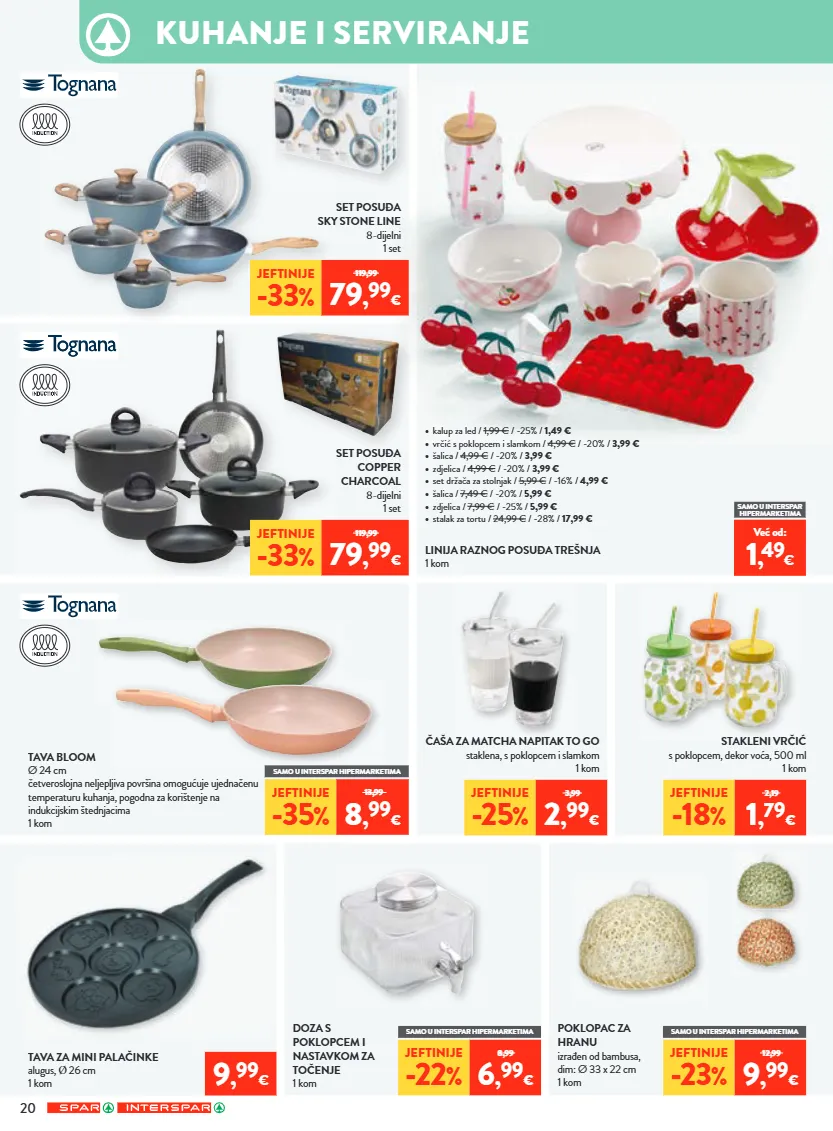 samo u interspar hipermarketima samo u interspar hipermarketima samo u interspar hipermarketima set posuđa sky stone line 8-dijelni 1 set set posuđa copper charcoal 8-dijelni 1 set stakleni vrčić s poklopcem, dekor voća, 500 ml 1 kom poklopac za hranu izrađen od bambusa, dim: ø 33 x 22 cm 1 kom doza s poklopcem i nastavkom za točenje 1 kom tava za mini palačinke alugus, ø 26 cm 1 kom linija raznog posuđa trešnja 1 kom tava bloom ø 24 cm četveroslojna neljepljiva površina omogućuje ujednačenu temperaturu kuhanja, pogodna za korištenje na indukcijskim štednjacima 1 kom 9 , 99 € jeftinije -35 % 13,99 8 , 99 € jeftinije -33 % 119,99 79 , 99 € jeftinije -33 % 119,99 79 , 99 € jeftinije -18 % 2,19 1 , 79 € jeftinije -23 % 12,99 9 , 99 € jeftinije -22 % 8,99 6 , 99 € već od: 1 , 49 € • kalup za led / 1,99 € / -25% / 1,49 € • vrčić s poklopcem i slamkom / 4,99 € / -20% / 3,99 € • šalica / 4,99 € / -20% / 3,99 € • zdjelica / 4,99 € / -20% / 3,99 € • set držača za stolnjak / 5,99 € / -16% / 4,99 € • šalica / 7,49 € / -20% / 5,99 € • zdjelica / 7,99 € / -25% / 5,99 € • stalak za tortu / 24,99 € / -28% / 17,99 € čaša za matcha napitak to go staklena, s poklopcem i slamkom 1 kom jeftinije -25 % 3,99 2 , 99 € samo u interspar hipermarketima 20 kuhanje i serviranje