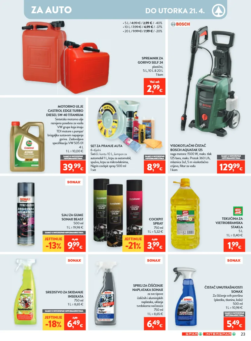 do utorka 21. 4. tekućina za vjetrobranska stakla 5 l 1 l = 0,40 € set za pranje auta 6-dijelni sadrži: kantu 10 l, šampon za automobil 1 l, krpu za automobil, spužvu, krpu sa mikrovlaknima, nigrin cockpit spray 500 ml 1 set spremnik za gorivo self 24 plastični, 5 l, 10 l ili 20 l 1 kom cockpit spray 750 ml 1 l = 5,32 € motorno ulje castrol edge turbo diesel 5w£40 titanium sintetsko motorno ulje razvijeno posebno za vozila vw grupe koja imaju tdi motore s pumpa/ brizgaljka sustavom napajanja goriva. zadovoljava specifikaciju vw 505 01 4 l 1 l = 10,00 € sprej za čišćenje naplataka sonax za sve tipove čeličnih i aluminijskih naplataka, uklanja tvrdokorne nečistoće 750 ml 1 l = 8,65 € čistač unutrašnjosti sonax za čišćenje svih površina (plastika, tkanina, koža) 500 ml 1 l = 10,98 € sjaj za gume sonax beast 500 ml 1 l = 19,98 € sredstvo za skidanje insekata 750 ml 1 l = 8,65 € jeftinije -21 % 5,09 3 , 99 € već od: 2 , 99 € • 5 l / 4.99 € / 2.99 € / -40% • 10 l / 7.99 € / 4.99 € / -37% • 20 l / 9.99 € / 7.99 € / -20% 6 , 49 € set za pranje auta 6-dijelni sadrži: kantu 10 l, šampon za 8 , 99 € samo u interspar hipermarketima 39 , 99 € samo u interspar hipermarketima 5 , 49 € 1 , 99 € samo u interspar hipermarketima jeftinije -18 % 7,99 6 , 49 € samo u interspar hipermarketima jeftinije -13 % 11,49 9 , 99 € samo u interspar hipermarketima za auto visokotlačni čistač bosch aquatak 125 naga motora: 1500 w, maks. tlak 125 bara, maks. protok 360 l/h, mlaznica 3u1, 5 m visokotlačno crijevo, filtar za vodu 1 kom 129 , 99 € samo u interspar hipermarketima 23
