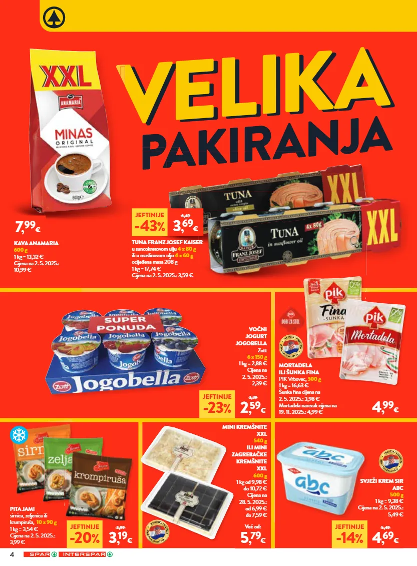 velika pakiranja velika 4 pakiranja pakiranja pakiranja pakiranja pakiranja velika velika velika velika velika već od: 5 , 79 € jeftinije -43 % 6,49 3 , 69 € tuna franz josef kaiser u suncokretovom ulju 4 x 80 g ili u maslinovom ulju 4 x 60 g ocijeđena masa 208 g 1 kg = 17,74 € cijena na 2. 5. 2025.: 3,59 € kava anamaria 600 g 1 kg = 13,32 € cijena na 2. 5. 2025.: 10,99 € jeftinije -20 % 3,99 3 , 19 € pita jami sirnica, zeljenica ili krumpiruša, 10 x 90 g 1 kg = 3,54 € cijena na 2. 5. 2025.: 3,99 € jeftinije -14 % 5,49 4 , 69 € mini kremšnite xxl 540 g ili mini zagrebačke kremšnite xxl 600 g 1 kg od 9,98 € do 10,72 € cijena na 28. 5. 2025.: od 6,99 € do 7,59 € voćni jogurt jogobella zott 6 x 150 g 1 kg = 2,88 € cijena na 2. 5. 2025.: 2,39 € jeftinije -23 % 3,39 2 , 59 € svježi krem sir abc 500 g 1 kg = 9,38 € cijena na 2. 5. 2025.: 5,49 € mortadela ili šunka fina pik vrbovec, 300 g 1 kg = 16,63 € šunka fina cijena na 2. 5. 2025.: 3,98 € mortadela narezak cijena na 19. 11. 2025.: 4,99 € 7 , 99 € 4 , 99 €