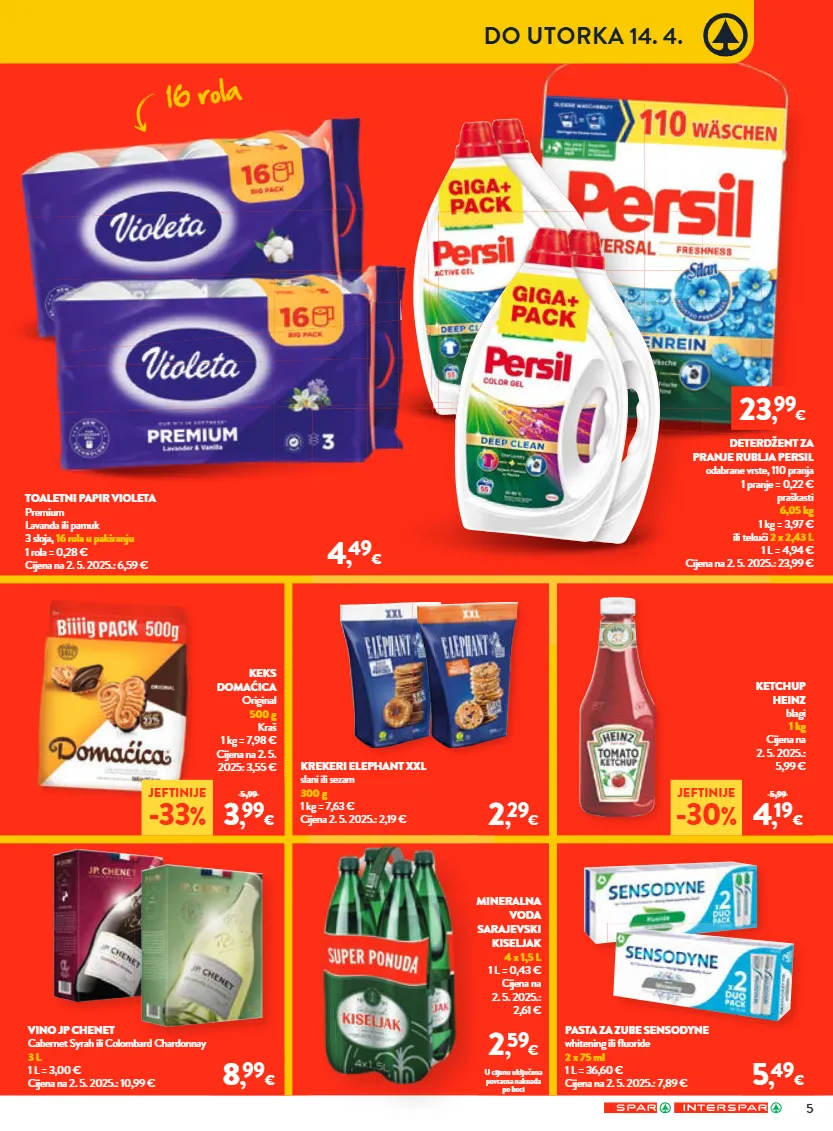 5 vino jp chenet cabernet syrah ili colombard chardonnay 3 l 1 l = 3,00 € cijena na 2. 5. 2025.: 10,99 € mineralna voda sarajevski kiseljak 4 x 1,5 l 1 l = 0,43 € cijena na 2. 5. 2025.: 2,61 € pasta za zube sensodyne whitening ili fluoride 2 x 75 ml 1 l = 36,60 € cijena na 2. 5. 2025.: 7,89 € ketchup heinz blagi 1 kg cijena na 2. 5. 2025.: 5,99 € jeftinije -30 % 5,99 4 , 19 € jeftinije -33 % 5,99 3 , 99 € 8 , 99 € 5 , 49 € keks domaćica original 500 g kraš 1 kg = 7,98 € cijena na 2. 5. 2025: 3,55 € toaletni papir violeta premium lavanda ili pamuk 3 sloja, 16 rola u pakiranju 1 rola = 0,28 € cijena na 2. 5. 2025.: 6,59 € krekeri elephant xxl slani ili sezam 300 g 1 kg = 7,63 € cijena 2. 5. 2025.: 2,19 € 16 rola 2 , 59 € u cijenu uključena povratna naknada po boci deterdžent za pranje rublja persil odabrane vrste, 110 pranja 1 pranje = 0,22 € praškasti 6,05 kg 1 kg = 3,97 € ili tekući 2 x 2,43 l 1 l = 4,94 € cijena na 2. 5. 2025.: 23,99 € 23 , 99 € 4 , 49 € do utorka 14. 4. 2 , 29 €