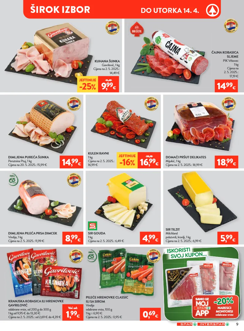 svježa orada lll cromaris 600 - 800 grama/komad 1 kg cijena na 2. 5. 2025.: 11,99 € 10 , 69 € 10 , 59 € svježi odrezak hame cromaris 1 kg cijena na 2. 5. 2025.: 12,79 € 14 , 99 € svinjski odrezak dilmar 400 g 1 kg = 8,73 € cijena na 2. 5. 2025.: 3,49 € 3 , 49 € premium ćevapčići spar bbq 480 g 1 kg = 8,31 € cijena na 2. 5. 2025.: 3,95€ 3 , 99 € svinjska potrbušina na pultu 1 kg cijena na 2. 5. 2025.: 4,29 € 3 , 79 € pileća krila 1 kg cijena na 2. 5. 2025.: 4,09 € pileći batak podložak 1 kg cijena na 31. 3. 2026.: 3,99 € 2 , 89 € 2 , 49 € patagonijska lignja 1 kg cijena na 2. 5. 2025.: 12,99 € 11 , 99 € svježi odrezak atlantskog lososa 1 kg cijena na 2. 5. 2025.: 12,99 € 13 , 99 € svježi cipal balavac 1 kg cijena na 2. 5. 2025.: 3,19 € svježi brancin cromaris 400 - 600 grama/komad 1 kg cijena na 2. 5. 2025.: 10,39 € 3 , 39 € 100% hrvatsko 7 ribarnica do utorka 14. 4.