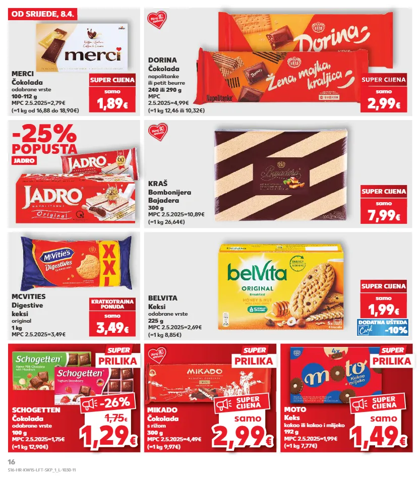 1,95 € kratkotrajna ponuda kratkotrajna ponuda kratkotrajna ponuda prilika kraš bombonijera bajadera 300 g mpc 2.5.2025=10,89€ (=1 kg 26,64€) (=1 kg 7,77€) moto keks kakao ili kakao i mlijeko 192 g mpc 2.5.2025=1,99€ (=1 kg 12,46 ili 10,32€) dorina čokolada napolitanke ili petit beurre 240 ili 290 g mpc 2.5.2025=4,99€ merci čokolada odabrane vrste 100-112 g mpc 2.5.2025=2,79€ (=1 kg od 16,88 do 18,90€) super cijena samo 1,89 € super cijena samo 7,99 € mcvities digestive keksi original 1 kg mpc 2.5.2025=3,49€ kratkotrajna ponuda samo 3,49 € kratkotrajna ponuda super cijena samo super cijena super cijena - - super cijena 0% super cijena 0% 0% super cijena 2,99 € schogetten čokolada odabrane vrste 100 g mpc 2.5.2025=1,75€ (=1 kg 12,90€) (=1 kg 9,97€) mikado čokolada s rižom 300 g mpc 2.5.2025=4,49€ jadro -25% popusta (=1 kg 8,85€) belvita keksi odabrane vrste 225 g mpc 2.5.2025=2,69€ samo 1,99 € super cijena -10% dodatna ušteda 1,29 1,29 € € -26 % 1,75 € 2,99 2,99 € € samo super cijena 1,4 9 1,49 € € samo super cijena od srijede, 8.4. super prilika super super super prilika super prilika super s16-hr-kw15-lft-skp_1_l-1030-11 16