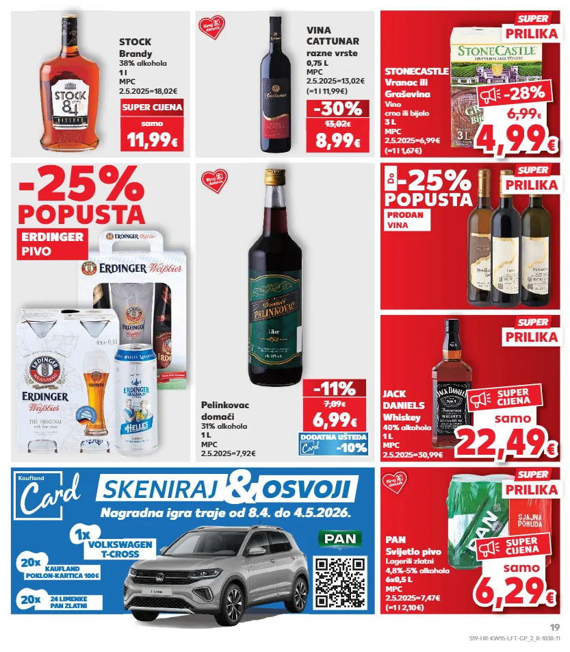 kratkotrajna ponuda samo kratkotrajna ponuda kratkotrajna ponuda samo stonecastle vranac ili graševina vino crno ili bijelo 3 l mpc 2.5.2025=6,99€ (=1 l 1,67€) jack daniels whiskey 40% alkohola 1 l mpc 2.5.2025=30,99€ vina cattunar razne vrste 0,75 l mpc 2.5.2025=13,02€ (=1 l 11,99€) -30% 8,99 € 13,02 € stock brandy 38% alkohola 1 l mpc 2.5.2025=18,02€ super cijena samo 11,99 € (=1 l 2,10€) pan svijetlo pivo lagerili zlatni 4,8%-5% alkohola 6x0,5 l mpc 2.5.2025=7,47€ prodan vina -25% popusta erdinger pivo -25% popusta -25% popusta pelinkovac domaći 31% alkohola 1 l mpc 2.5.2025=7,92€ 6,99 € -11% 7,89 € -10% dodatna ušteda 4,9 9 € -28 % 6,99 € 22,49 € samo super cijena 6,29 6,29 € € samo super cijena do nagradna igra traje od 8.4. do 4.5.2026. nagradna igra traje od 8.4. do 4.5.2026. volkswagen t-cross 1x kaufland poklon-kartica 100€ 20x 24 limenke pan zlatni 20x skeniraj osvoji & prilika super prilika super prilika super prilika super s19-hr-kw15-lft-gp_2_r-1030-11 19