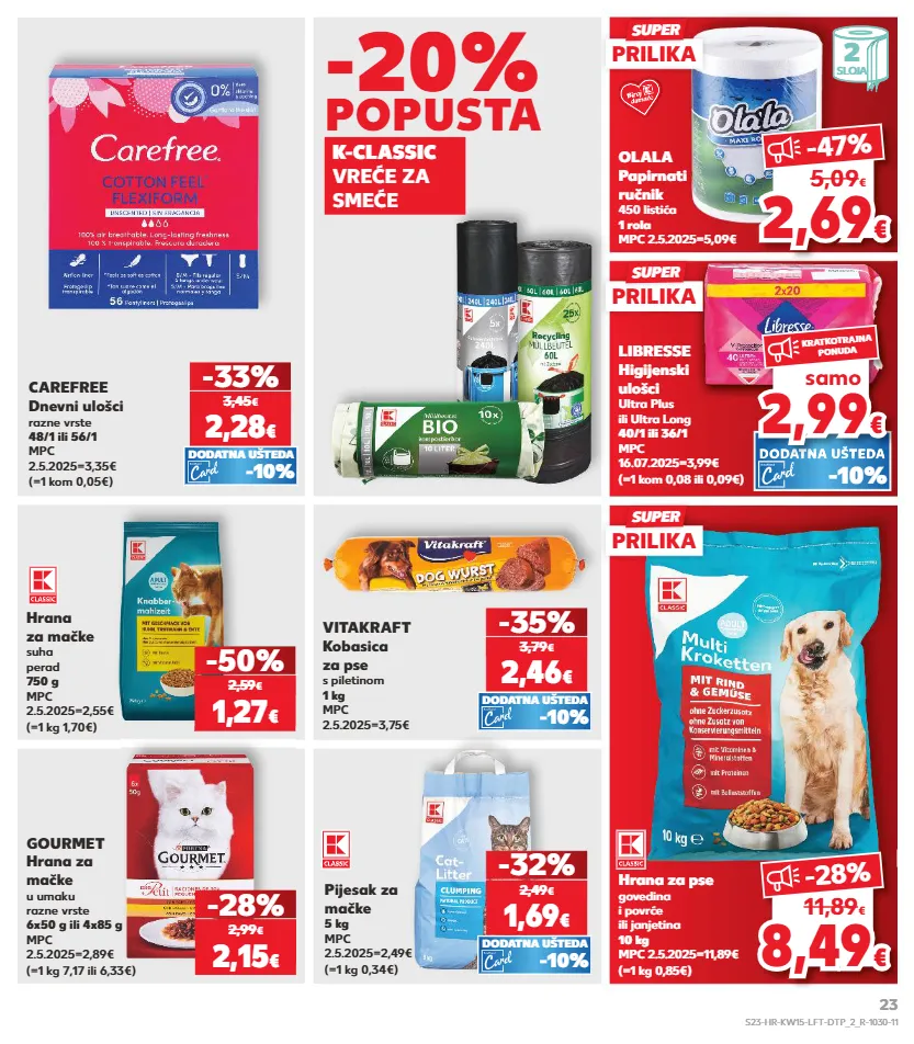 kratkotrajna ponuda kratkotrajna ponuda samo samo kratkotrajna ponuda samo kratkotrajna ponuda samo kratkotrajna ponuda samo dodatna ušteda hrana za mačke suha perad 750 g mpc 2.5.2025=2,55€ (=1 kg 1,70€) -50% gourmet hrana za mačke u umaku razne vrste 6x50 g ili 4x85 g mpc 2.5.2025=2,89€ (=1 kg 7,17 ili 6,33€) hrana za pse govedina i povrće ili janjetina 10 kg mpc 2.5.2025=11,89€ (=1 kg 0,85€) -28% 1,27 € 2,59 € 2,15 € 2,99 € k-classic vreće za smeće -20% popusta (=1 kom 0,08 ili 0,09€) libresse higijenski ulošci ultra plus ili ultra long 40/1 ili 36/1 mpc 16.07.2025=3,99€ (=1 kom 0,05€) carefree dnevni ulošci razne vrste 48/1 ili 56/1 mpc 2.5.2025=3,35€ 2,28 € -33% 3,45 € -10% dodatna ušteda (=1 kg 0,34€) pijesak za mačke 5 kg mpc 2.5.2025=2,49€ 1,69 € -32% 2,49 € vitakraft kobasica za pse s piletinom 1 kg mpc 2.5.2025=3,75€ 2,46 € -35% 3,79 € -10% dodatna ušteda -10% dodatna ušteda olala papirnati ručnik 450 listića 1 rola mpc 2.5.2025=5,09€ 2 sloja 2,6 9 2,69 € € -47 % 5,09 € -10% dodatna ušteda dodatna ušteda 2,99 2,99 € € samo kratkotrajna ponuda 8,4 9 8,49 € € -28 % 11,89 € prilika super prilika super prilika super s23-hr-kw15-lft-dtp_2_r-1030-11 23