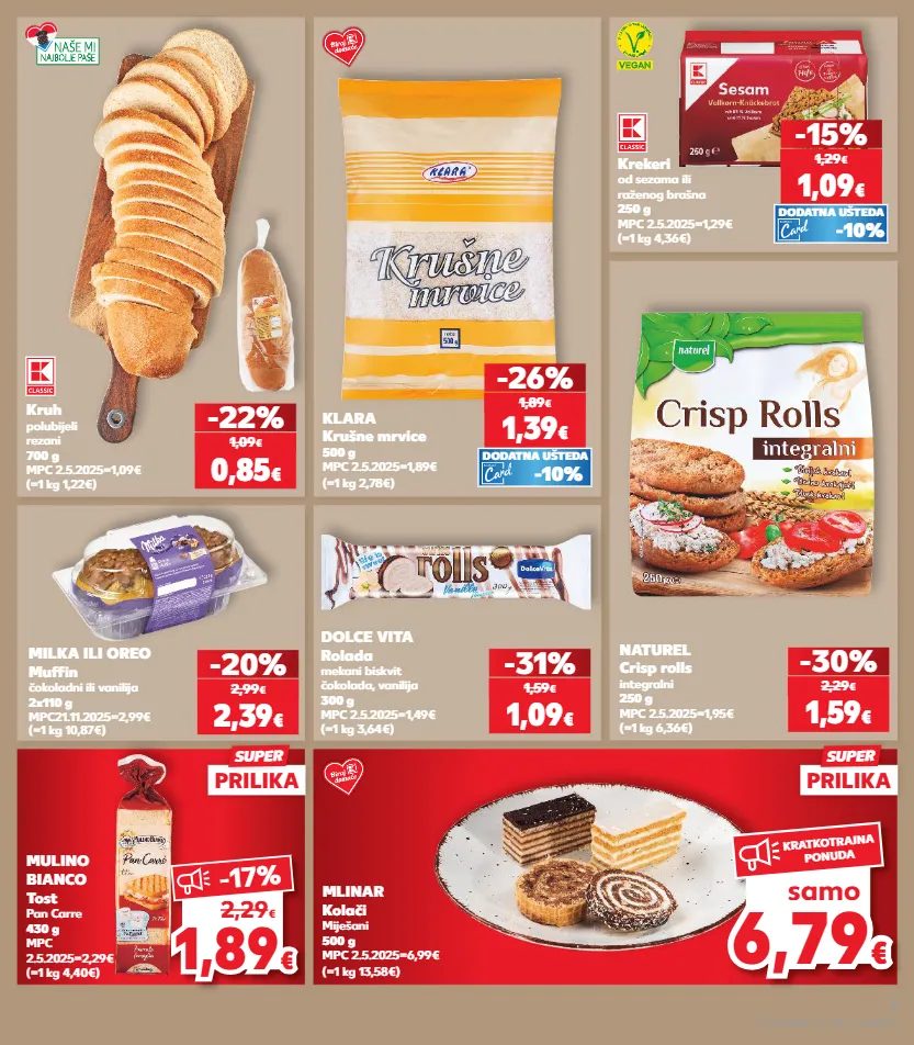 kratkotrajna ponuda kratkotrajna ponuda kratkotrajna ponuda samo samo kratkotrajna ponuda samo samo kratkotrajna ponuda samo kratkotrajna ponuda samo 6,7 9 6,79 € € samo kratkotrajna ponuda naturel crisp rolls integralni 250 g mpc 2.5.2025=1,95€ (=1 kg 6,36€) -30% mlinar kolači miješani 500 g mpc 2.5.2025=6,99€ (=1 kg 13,58€) (=1 kg 1,22€) kruh polubijeli rezani 700 g mpc 2.5.2025=1,09€ -22% milka ili oreo muffin čokoladni ili vanilija 2x110 g mpc21.11.2025=2,99€ (=1 kg 10,87€) -20% 2,39 € 2,99 € 1,59 € 2,29 € dolce vita rolada mekani biskvit čokolada, vanilija 300 g mpc 2.5.2025=1,49€ (=1 kg 3,64€) -31% 1,09 € 1,59 € (=1 kg 4,40€) mulino bianco tost pan carre 430 g mpc 2.5.2025=2,29€ 0,85 € 1,09 € (=1 kg 4,36€) krekeri od sezama ili raženog brašna 250 g mpc 2.5.2025=1,29€ (=1 kg 2,78€) klara krušne mrvice 500 g mpc 2.5.2025=1,89€ 1,09 € -15% 1,29 € -26% 1,39 € 1,89 € -10% dodatna ušteda -10% dodatna ušteda 1,8 9 1,89 € € -17% 2,29 € prilika super prilika super s7-hr-kw15-lft-bp_2_r-1030-11 7