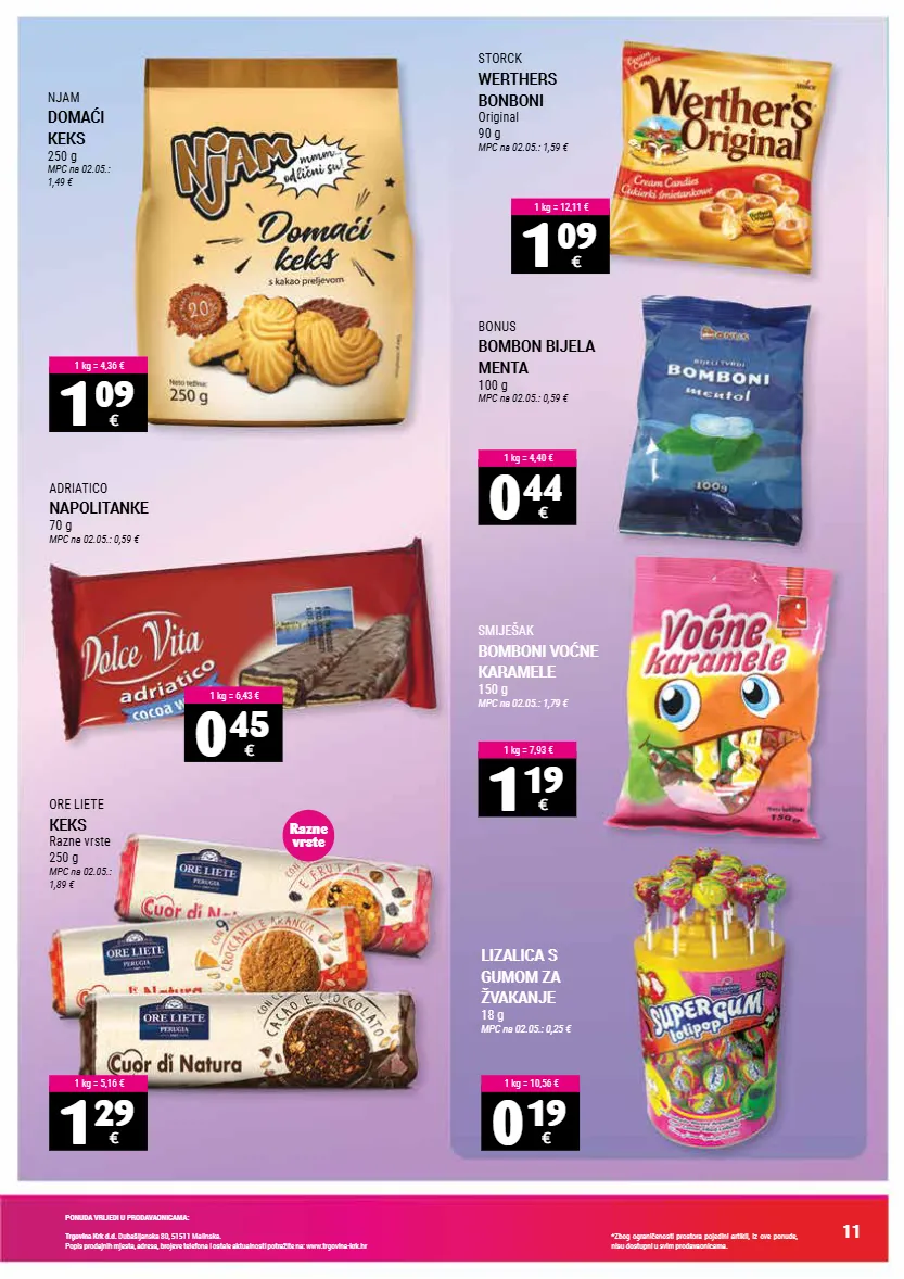 ponuda vrijedi u prodavaonicama: trgovina krk d.d. dubašljanska 80, 51511 malinska. popis prodajnih mjesta, adresa, brojeve telefona i ostale aktualnosti potražite na: www.trgovina-krk.hr *zbog ograničenosti prostora pojedini artikli, iz ove ponude, nisu dostupni u svim prodavaonicama. 11 storck werthers bonboni original 90 g mpc na 02.05.: 1,59 € smiješak bomboni voćne karamele 150 g mpc na 02.05.: 1,79 € ore liete keks razne vrste 250 g mpc na 02.05.: 1,89 € lizalica s gumom za žvakanje 18 g mpc na 02.05.: 0,25 € adriatico napolitanke 70 g mpc na 02.05.: 0,59 € bonus bombon bijela menta 100 g mpc na 02.05.: 0,59 € njam domaći keks 250 g mpc na 02.05.: 1,49 € 1 09 € 1 kg = 12,11 € 1 19 € 1 kg = 7,93 € 1 29 € 1 kg = 5,16 € 0 19 € 1 kg = 10,56 € 0 45 € 1 kg = 6,43 € 0 44 € 1 kg = 4,40 € 1 09 € 1 kg = 4,36 € razne vrste