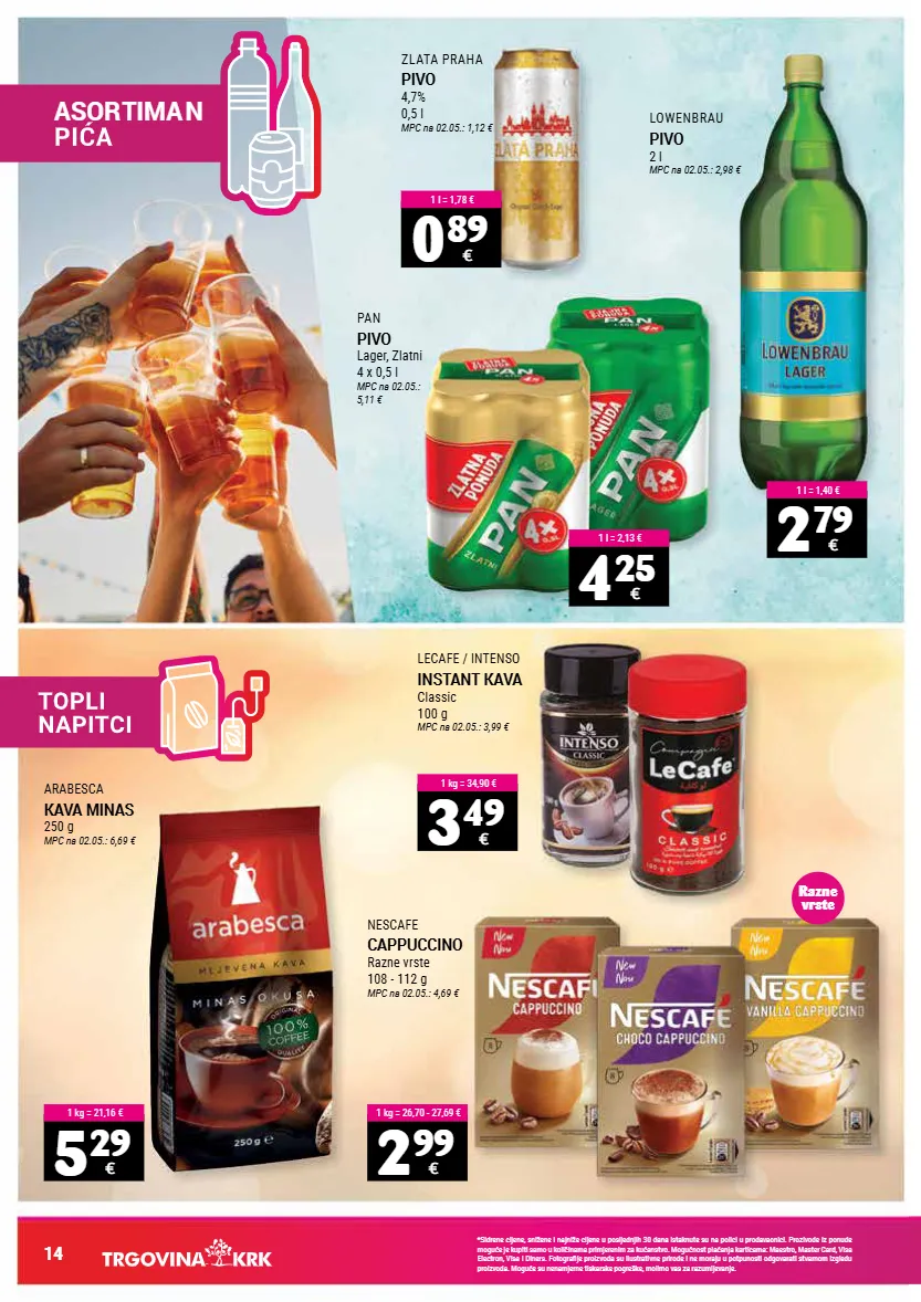 *sidrene cijene, snižene i najniže cijene u posljednjih 30 dana istaknute su na polici u prodavaonici. prozivode iz ponude moguće je kupiti samo u količinama primjerenim za kućanstvo. mogućnost plaćanja karticama: maestro, master card, visa electron, visa i diners. fotografije proizvoda su ilustrativne prirode i ne moraju u potpunosti odgovarati stvarnom izgledu proizvoda. moguće su nenamjerne tiskarske pogreške, molimo vas za razumijevanje. 14 asortima n zlata praha pivo 4,7% 0,5 l mpc na 02.05.: 1,12 € lowenbrau pivo 2 l mpc na 02.05.: 2,98 € pan pivo lager, zlatni 4 x 0,5 l mpc na 02.05.: 5,11 € 0 89 € 1 l = 1,78 € 2 79 € 1 l = 1,40 € 4 25 € 1 l = 2,13 € arabesca kava minas 250 g mpc na 02.05.: 6,69 € lecafe / intenso instant kava classic 100 g mpc na 02.05.: 3,99 € nescafe cappuccino razne vrste 108 - 112 g mpc na 02.05.: 4,69 € 5 29 € 1 kg = 21,16 € 3 49 € 1 kg = 34,90 € 2 99 € 1 kg = 26,70 - 27,69 € razne vrste