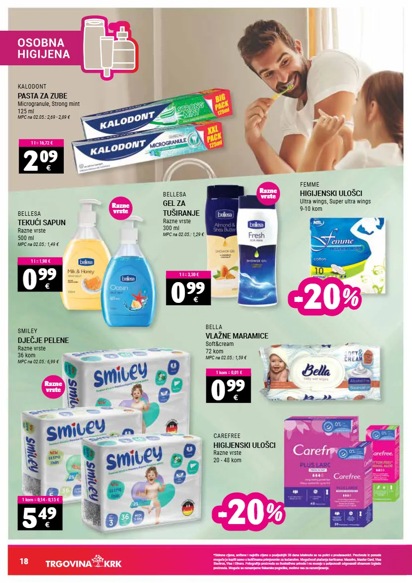 *sidrene cijene, snižene i najniže cijene u posljednjih 30 dana istaknute su na polici u prodavaonici. prozivode iz ponude moguće je kupiti samo u količinama primjerenim za kućanstvo. mogućnost plaćanja karticama: maestro, master card, visa electron, visa i diners. fotografije proizvoda su ilustrativne prirode i ne moraju u potpunosti odgovarati stvarnom izgledu proizvoda. moguće su nenamjerne tiskarske pogreške, molimo vas za razumijevanje. 18 femme higijenski ulošci ultra wings, super ultra wings 9-10 kom bella vlažne maramice soft&cream 72 kom mpc na 02.05.: 1,59 € smiley dječje pelene razne vrste 36 kom mpc na 02.05.: 6,99 € bellesa gel za tuširanje razne vrste 300 ml mpc na 02.05.: 1,29 € carefree higijenski ulošci razne vrste 20 - 48 kom kalodont pasta za zube microgranule, strong mint 125 ml mpc na 02.05.: 2,69 - 2,89 € bellesa tekući sapun razne vrste 500 ml mpc na 02.05.: 1,49 € 0 99 € 1 kom = 0,01 € 5 49 € 1 kom = 0,14 - 0,15 € 0 99 € 1 l = 3,30 € 2 09 € 1 l = 16,72 € 0 99 € 1 l = 1,98 € -20 -20 % % -20 -20 % % razne vrste razne vrste razne vrste