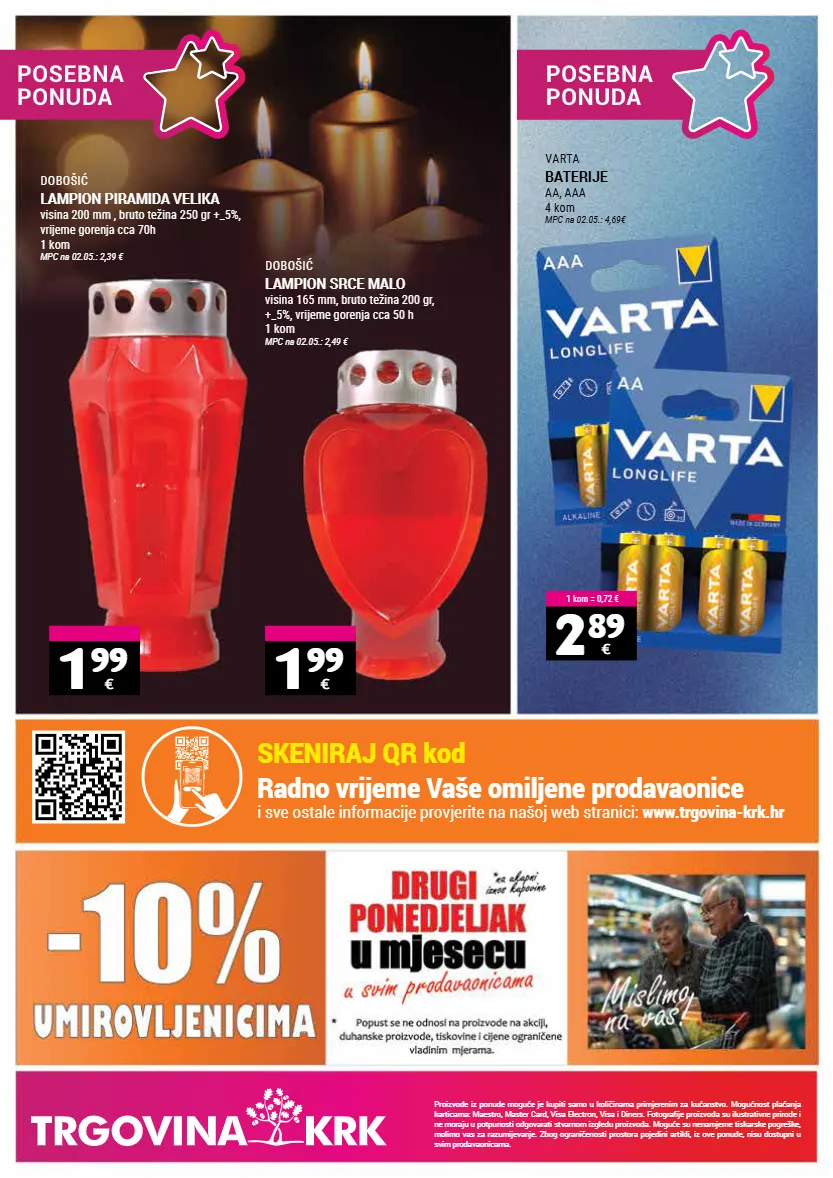 radno vrijeme vaše omiljene prodavaonice i sve ostale informacije provjerite na našoj web stranici: www.trgovina-krk.hr skeniraj qr kod proizvode iz ponude moguće je kupiti samo u količinama primjerenim za kućanstvo. mogućnost plaćanja karticama: maestro, master card, visa electron, visa i diners. fotografije proizvoda su ilustrativne prirode i ne moraju u potpunosti odgovarati stvarnom izgledu proizvoda. moguće su nenamjerne tiskarske pogreške, molimo vas za razumijevanje. zbog ograničenosti prostora pojedini artikli, iz ove ponude, nisu dostupni u svim prodavaonicama. 1 99 € 1 99 € 2 89 € 1 kom = 0,72 € dobošić lampion piramida velika visina 200 mm , bruto težina 250 gr +_5%, vrijeme gorenja cca 70h 1 kom mpc na 02.05.: 2,39 € varta baterije aa, aaa 4 kom mpc na 02.05.: 4,69€ dobošić lampion srce malo visina 165 mm, bruto težina 200 gr, +_5%, vrijeme gorenja cca 50 h 1 kom mpc na 02.05.: 2,49 €