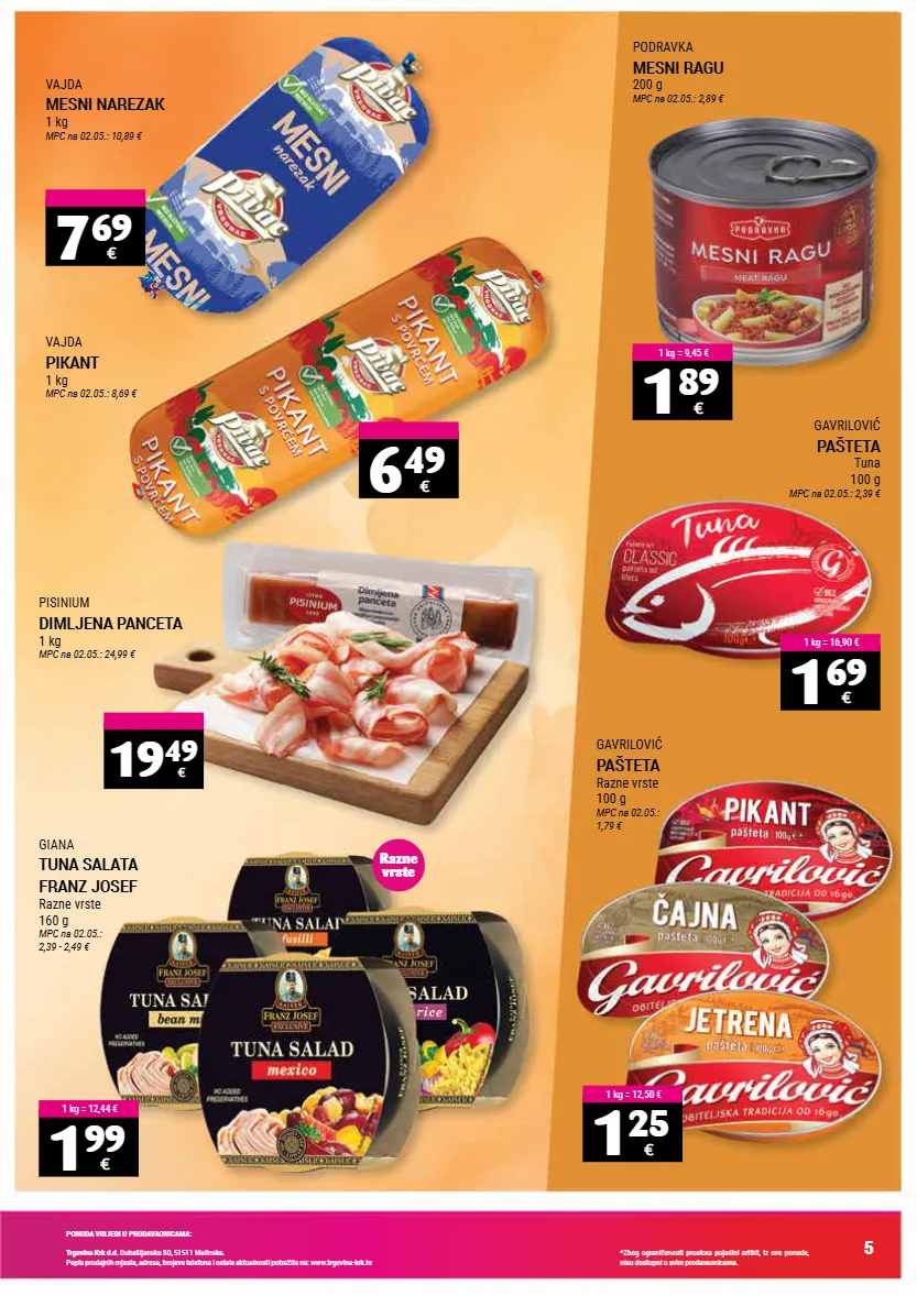 ponuda vrijedi u prodavaonicama: trgovina krk d.d. dubašljanska 80, 51511 malinska. popis prodajnih mjesta, adresa, brojeve telefona i ostale aktualnosti potražite na: www.trgovina-krk.hr *zbog ograničenosti prostora pojedini artikli, iz ove ponude, nisu dostupni u svim prodavaonicama. 5 1 25 € 1 kg = 12,50 € 1 69 € 1 kg = 16,90 € 7 69 € 6 49 € pisinium dimljena panceta 1 kg mpc na 02.05.: 24,99 € gavrilović pašteta razne vrste 100 g mpc na 02.05.: 1,79 € gavrilović pašteta tuna 100 g mpc na 02.05.: 2,39 € vajda mesni narezak 1 kg mpc na 02.05.: 10,89 € vajda pikant 1 kg mpc na 02.05.: 8,69 € 19 49 € giana tuna salata franz josef razne vrste 160 g mpc na 02.05.: 2,39 - 2,49 € podravka mesni ragu 200 g mpc na 02.05.: 2,89 € 1 99 € 1 kg = 12,44 € 1 89 € 1 kg = 9,45 € razne vrste