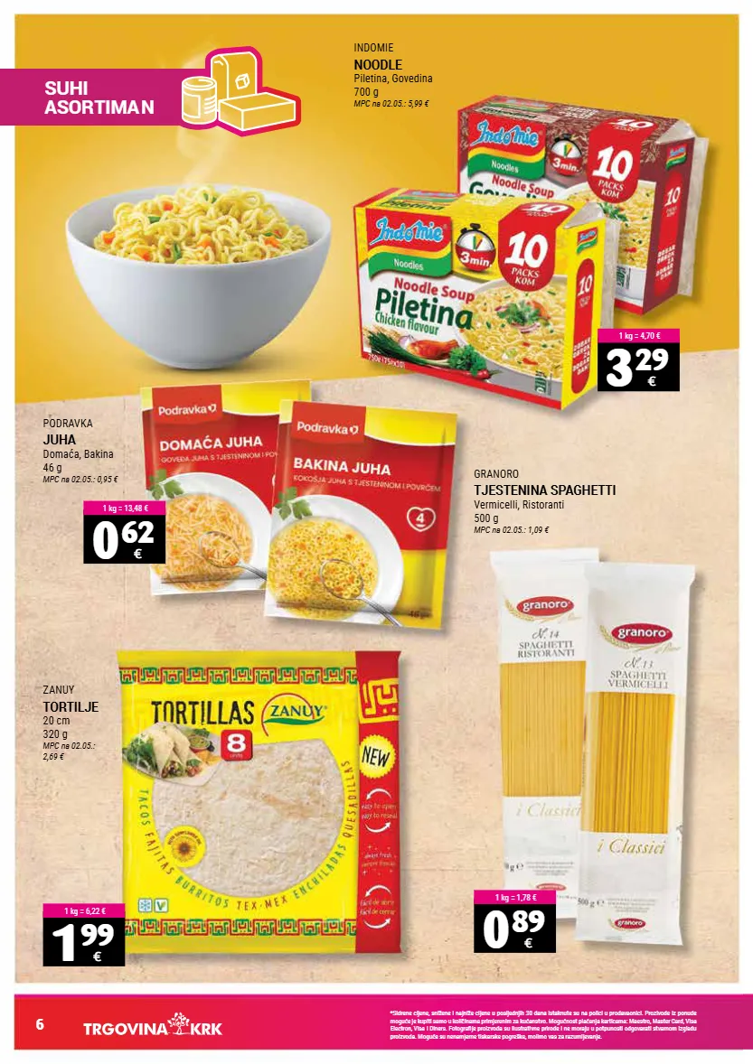 *sidrene cijene, snižene i najniže cijene u posljednjih 30 dana istaknute su na polici u prodavaonici. prozivode iz ponude moguće je kupiti samo u količinama primjerenim za kućanstvo. mogućnost plaćanja karticama: maestro, master card, visa electron, visa i diners. fotografije proizvoda su ilustrativne prirode i ne moraju u potpunosti odgovarati stvarnom izgledu proizvoda. moguće su nenamjerne tiskarske pogreške, molimo vas za razumijevanje. 6 suhi asortima n granoro tjestenina spaghetti vermicelli, ristoranti 500 g mpc na 02.05.: 1,09 € podravka juha domaća, bakina 46 g mpc na 02.05.: 0,95 € indomie noodle piletina, govedina 700 g mpc na 02.05.: 5,99 € zanuy tortilje 20 cm 320 g mpc na 02.05.: 2,69 € 0 89 € 1 kg = 1,78 € 0 62 € 1 kg = 13,48 € 3 29 € 1 kg = 4,70 € 1 99 € 1 kg = 6,22 €