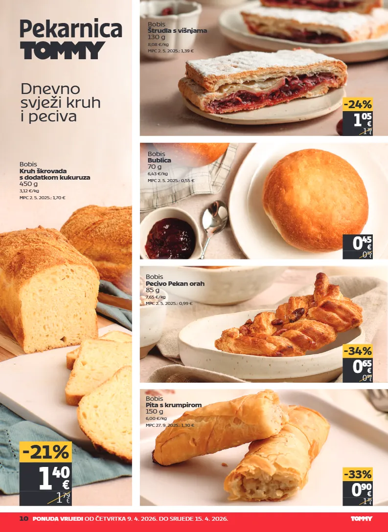 10 ponuda vrijedi od četvrtka 9. 4. 2026. do srijede 15. 4. 2026. pekarnica dnevno svježi kruh i peciva bobis kruh škrovada s dodatkom kukuruza 450 g 3,12 €/kg mpc 2. 5. 2025.: 1,70 € 1 40 1 79 -21% bobis bublica 70 g 6,43 €/kg mpc 2. 5. 2025.: 0,55 € 0 45 0 55 bobis štrudla s višnjama 130 g 8,08 €/kg mpc 2. 5. 2025.: 1,39 € 1 05 1 39 -24% bobis pita s krumpirom 150 g 6,00 €/kg mpc 27. 9. 2025.: 1,30 € bobis pecivo pekan orah 85 g 7,65 €/kg mpc 2. 5. 2025.: 0,99 € 0 65 0 99 -34% 0 90 1 35 -33%