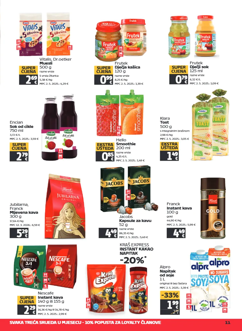 svaka treća srijeda u mjesecu - 10% popusta za loyalty članove 11 vitalis, dr.oetker muesli 500 g razne vrste 5 vrsta žitarica 5,38 €/kg mpc 2. 5. 2025.: 4,29 € 2 69 super cijena frutek dječji sok 125 ml razne vrste 6,32 €/l mpc 2. 5. 2025.: 1,09 € 0 79 super cijena hello smoothie 200 ml razne vrste 4,25 €/l mpc 2. 5. 2025.: 1,49 € 0 85 ekstra ušteda encian sok od cikle 750 ml 3,72 €/l mpc 2. 5. 2025.: 3,59 € 2 79 super cijena klara tost 500 g s integralnim brašnom 2,98 €/kg mpc 2. 5. 2025.: 3,05 € 1 49 ekstra ušteda jubilarna, franck mljevena kava 300 g 17,64 €/kg mpc 12. 3. 2026.: 6,59 € 5 29 jacobs kapsule za kavu 52 g razne vrste 86,35 €/kg mpc 2. 5. 2025.: 5,49 € 4 49 franck instant kava 100 g gold 44,90 €/kg mpc 2. 5. 2025.: 5,99 € 4 49 kraš express instant kakao napitak -20% * frutek dječja kašica 120 g razne vrste 8,25 €/kg mpc 2. 5. 2025.: 1,39 € 0 99 super cijena nescafe instant kava 140 g ili 155 g razne vrste 16,36 €/kg ili 14,78 €/kg mpc 2. 5. 2025.: 2,99 € 2 29 super cijena alpro napitak od soje 1 l original ili bez šećera mpc 2. 5. 2025.: 3,39 € 1 99 2 99 -33%