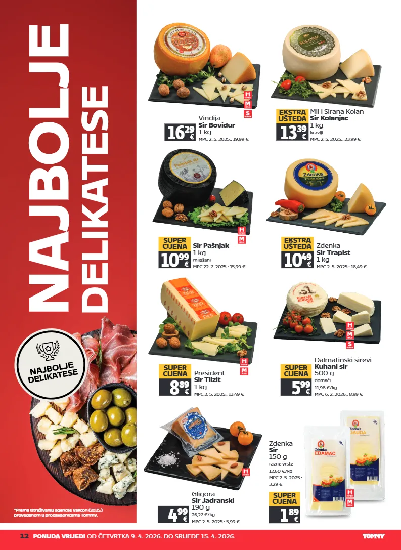 *prema istraživanju agencije valicon (2025.) provedenom u prodavaonicama tommy. 12 ponuda vrijedi od četvrtka 9. 4. 2026. do srijede 15. 4. 2026. vindija sir bovidur 1 kg mpc 2. 5. 2025.: 19,99 € 16 29 13 39 ekstra ušteda mih sirana kolan sir kolanjac 1 kg kravlji mpc 2. 5. 2025.: 23,99 € 10 99 super cijena sir pašnjak 1 kg miješani mpc 22. 7. 2025.: 15,99 € 10 49 ekstra ušteda zdenka sir trapist 1 kg mpc 2. 5. 2025.: 18,49 € 8 89 super cijena president sir tilzit 1 kg mpc 2. 5. 2025.: 13,49 € dalmatinski sirevi kuhani sir 500 g domaći 11,98 €/kg mpc 6. 2. 2026.: 8,99 € 5 99 super cijena gligora sir jadranski 190 g 26,27 €/kg mpc 2. 5. 2025.: 5,99 € 4 99 zdenka sir 150 g razne vrste 12,60 €/kg mpc 2. 5. 2025.: 3,29 € 1 89 super cijena