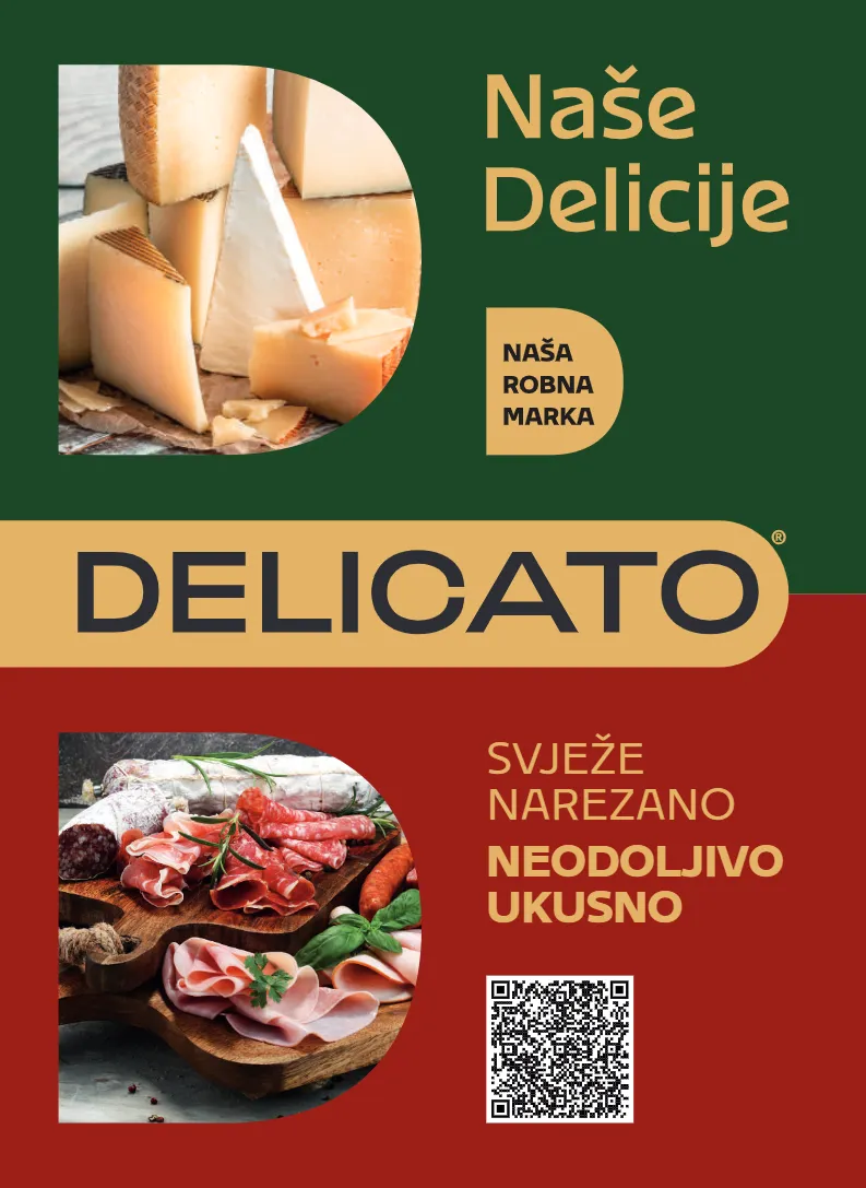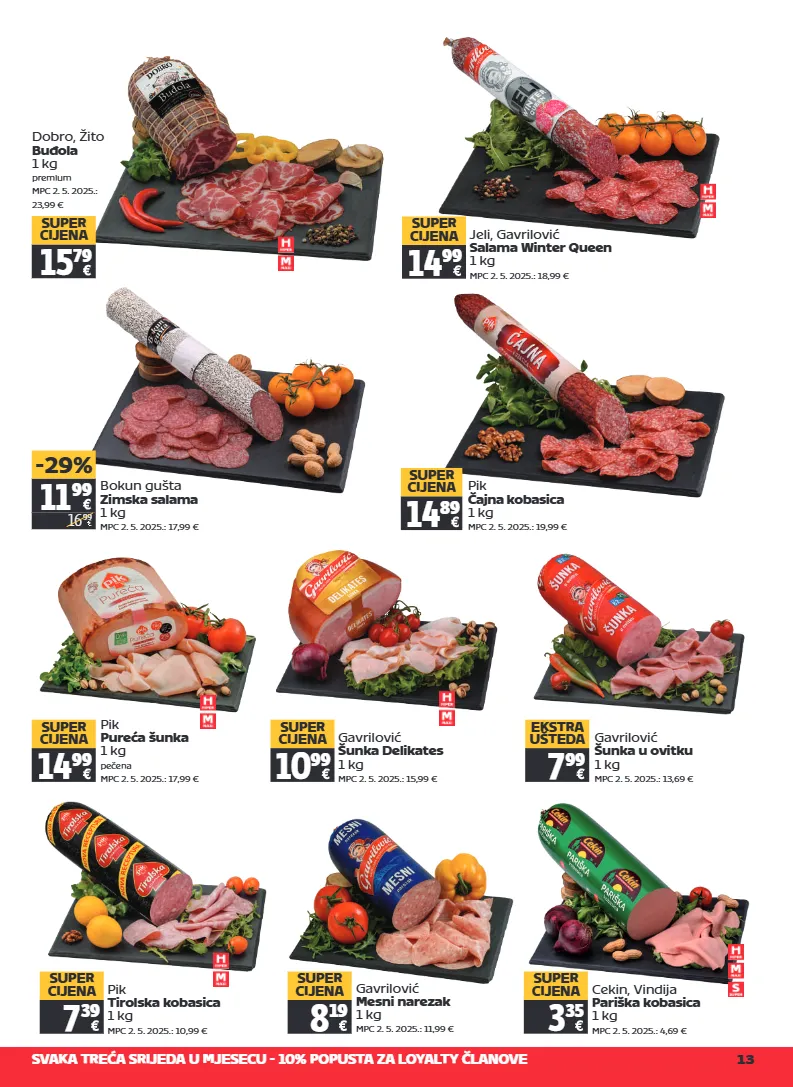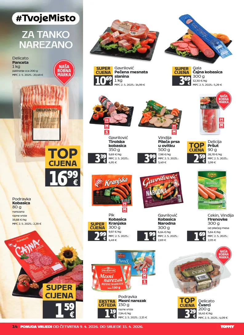 14 ponuda vrijedi od četvrtka 9. 4. 2026. do srijede 15. 4. 2026. za tanko narezano 10 69 super cijena gavrilović pečena mesnata slanina 1 kg mpc 2. 5. 2025.: 14,99 € gala čajna kobasica 300 g 12,30 €/kg mpc 2. 5. 2025.: 5,29 € 3 69 super cijena gavrilović tirolska kobasica 350 g 9,69 €/kg mpc 2. 5. 2025.: 4,95 € 3 39 vindija pileća prsa u ovitku 500 g 7,98 €/kg mpc 2. 5. 2025.: 5,49 € 3 99 delicija pršut 90 g 28,78 €/kg mpc 2. 5. 2025.: 3,99 € 2 59 top cijena pik kobasica kranjska 300 g 9,97 €/kg mpc 2. 5. 2025.: 4,49 € 2 99 super cijena gavrilović kobasica narodna 300 g 6,64 €/kg mpc 2. 5. 2025.: 2,69 € 1 99 cekin, vindija hrenovke 300 g od pilećeg mesa 5,64 €/kg mpc 2. 5. 2025.: 2,05 € 1 69 delicato čvarci 200 g 16,45 €/kg mpc 2. 5. 2025.: 4,09 € 3 29 top cijena za tanko narezano delicato panceta 1 kg pakiranje cca 200 g mpc 2. 5. 2025.: 20,49 € 16 99 top cijena podravka kobasica 80 g narezana razne vrste 19,88 €/kg mpc 2. 5. 2025.: 2,29 € 1 59 super cijena podravka mesni narezak 150 g razne vrste 7,94 €/kg mpc 2. 5. 2025.: 2,15 € 1 19 ekstra ušteda