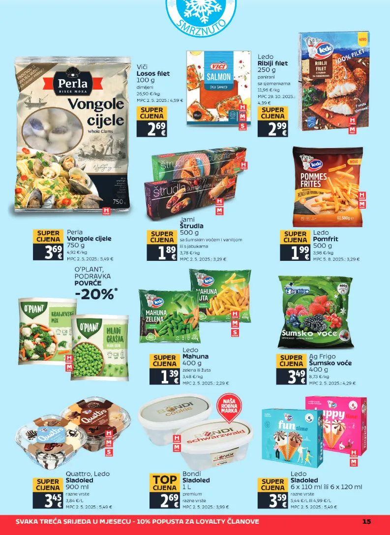 svaka treća srijeda u mjesecu - 10% popusta za loyalty članove 7 6 19 6 99 3 49 3 99 roster, cekin svježe pile 1 kg mpc 2. 5. 2025.: 3,32 € 3 18 cekin, vindija file od pilećih prsa 500 g 11,10 €/kg mpc 2. 5. 2025.: 5,95 € 5 55 cekin, vindija pileći batak sa zabatkom i dio leđa 1 kg mpc 2. 5. 2025.: 4,69 € 3 49 vindon, vindija pureće mesne okruglice 420 g 9,50 €/kg mpc 2. 5. 2025.: 5,29 € 3 99 super cijena majstori o’ gradela svinjski vrat 1 kg s kosti u texas marinadi mpc 2. 5. 2025.: 6,49 € majstori o’ gradela cheeseburger 400 g 8,73 €/kg mpc 2. 5. 2025.: 4,49 €