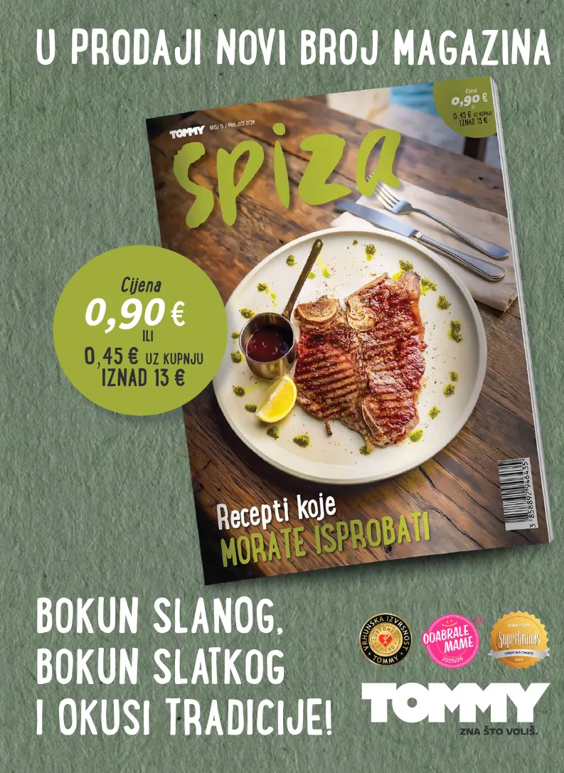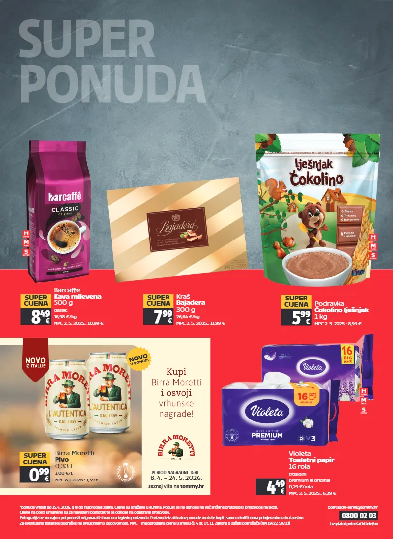 32 ponuda vrijedi od četvrtka 9. 4. 2026. do srijede 15. 4. 2026. super ponuda 0800 02 03 *ponuda vrijedi do 15. 4. 2026. g ili do rasprodaje zaliha. cijene su izražene u eurima. popust se ne odnose na već snižene proizvode i proizvode na akciji. cijene na polici umanjene su za navedeni postotak te se odnose na odabrane proizvode. fotografije ne moraju u potpunosti odgovarati stvarnom izgledu proizvoda. proizvode iz aktualne ponude možete kupiti samo u količinama primjerenim za kućanstvo. za eventualne tiskarske pogreške ne preuzimamo odgovornost. mpc = maloprodajna cijena u smislu čl. 4 st. 1 t. 11. zakona o zaštiti potrošača (nn 19/22, 59/23) besplatni potrošački telefon potrosacki-servis@tommy.hr barcaffe kava mljevena 500 g classic 16,98 €/kg mpc 2. 5. 2025.: 10,99 € 8 49 super cijena kraš bajadera 300 g 26,64 €/kg mpc 2. 5. 2025.: 11,99 € 7 99 super cijena podravka čokolino lješnjak 1 kg mpc 2. 5. 2025.: 8,99 € 5 99 super cijena 4 49 violeta toaletni papir 16 rola troslojni premium ili original 0,29 €/rola mpc 2. 5. 2025.: 6,29 € birra moretti pivo 0,33 l 3,00 €/l mpc 8.1.2026.: 1,39 € 0 99 super cijena period nagradne igre: 8. 4. – 24. 5. 2026. saznaj više na tommy.hr