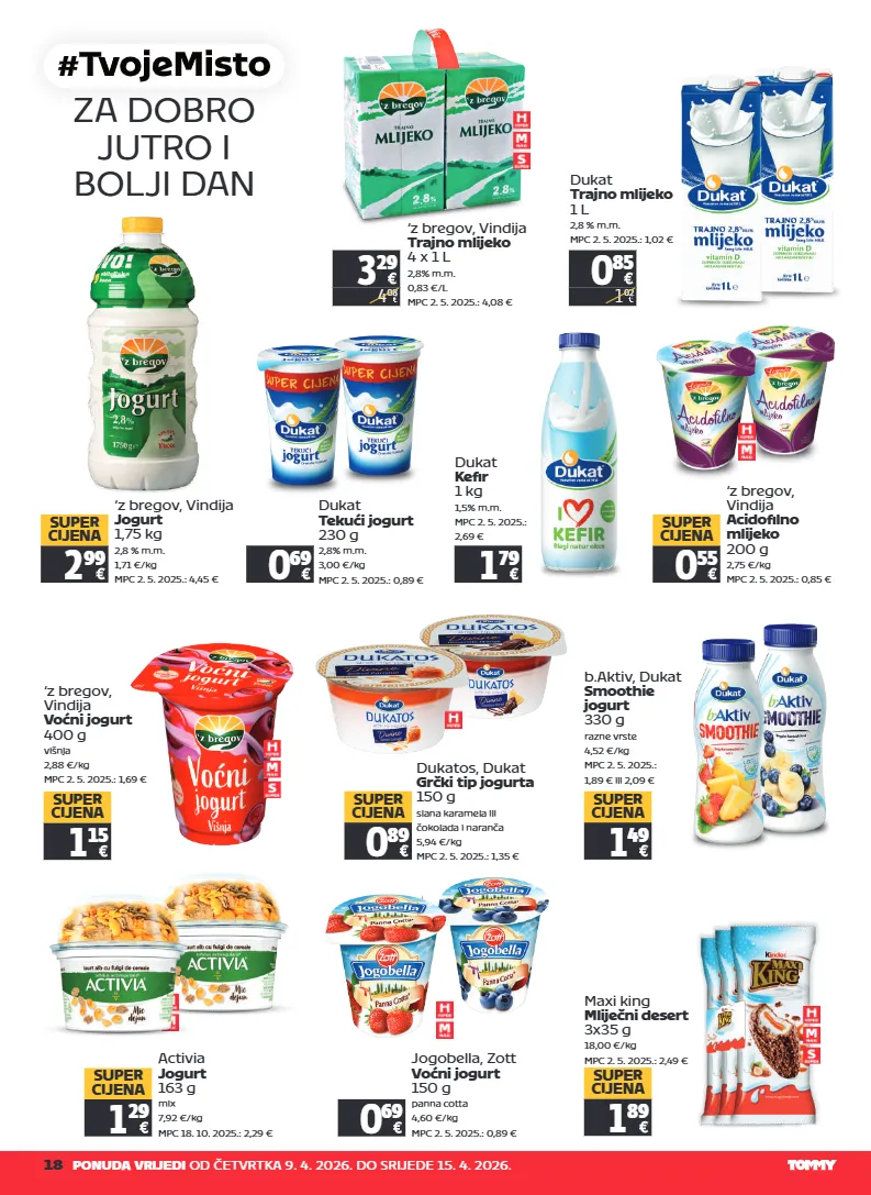 18 ponuda vrijedi od četvrtka 9. 4. 2026. do srijede 15. 4. 2026. za dobro jutro i bolji dan dukat tekući jogurt 230 g 2,8% m.m. 3,00 €/kg mpc 2. 5. 2025.: 0,89 € 0 69 dukatos, dukat grčki tip jogurta 150 g slana karamela ili čokolada i naranča 5,94 €/kg mpc 2. 5. 2025.: 1,35 € 0 89 super cijena ‘z bregov, vindija voćni jogurt 400 g višnja 2,88 €/kg mpc 2. 5. 2025.: 1,69 € 1 15 super cijena activia jogurt 163 g mix 7,92 €/kg mpc 18. 10. 2025.: 2,29 € 1 29 super cijena 0 85 1 02 dukat trajno mlijeko 1 l 2,8 % m.m. mpc 2. 5. 2025.: 1,02 € dukat kefir 1 kg 1,5% m.m. mpc 2. 5. 2025.: 2,69 € 1 79 ‘z bregov, vindija acidofilno mlijeko 200 g 2,75 €/kg mpc 2. 5. 2025.: 0,85 € 0 55 super cijena b.aktiv, dukat smoothie jogurt 330 g razne vrste 4,52 €/kg mpc 2. 5. 2025.: 1,89 € ili 2,09 € 1 49 super cijena jogobella, zott voćni jogurt 150 g panna cotta 4,60 €/kg mpc 2. 5. 2025.: 0,89 € 0 69 3 29 4 08 ‘z bregov, vindija trajno mlijeko 4 x 1 l 2,8% m.m. 0,83 €/l mpc 2. 5. 2025.: 4,08 € ‘z bregov, vindija jogurt 1,75 kg 2,8 % m.m. 1,71 €/kg mpc 2. 5. 2025.: 4,45 € 2 99 super cijena maxi king mliječni desert 3x35 g 18,00 €/kg mpc 2. 5. 2025.: 2,49 € 1 89 super cijena