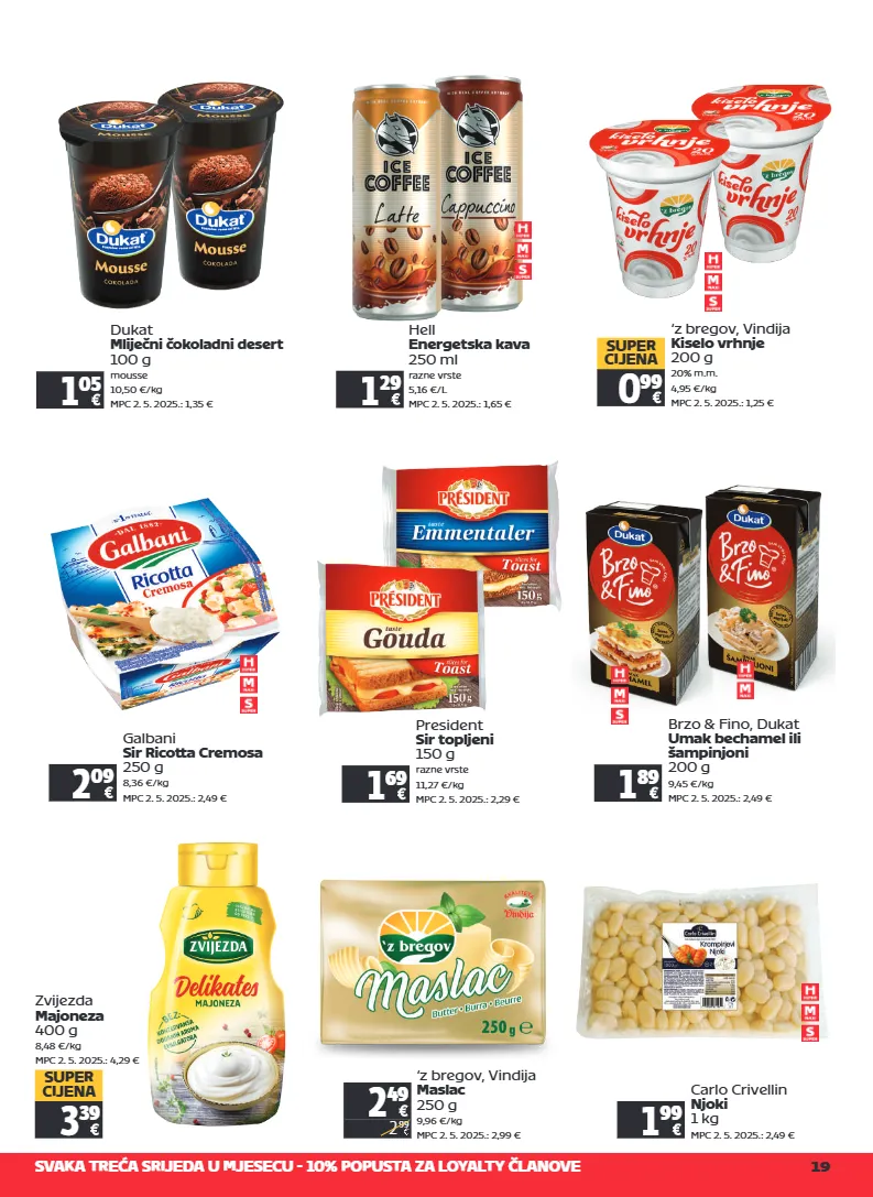 svaka treća srijeda u mjesecu - 10% popusta za loyalty članove 19 dukat mliječni čokoladni desert 100 g mousse 10,50 €/kg mpc 2. 5. 2025.: 1,35 € 1 05 galbani sir ricotta cremosa 250 g 8,36 €/kg mpc 2. 5. 2025.: 2,49 € 2 09 president sir topljeni 150 g razne vrste 11,27 €/kg mpc 2. 5. 2025.: 2,29 € 1 69 brzo & fino, dukat umak bechamel ili šampinjoni 200 g 9,45 €/kg mpc 2. 5. 2025.: 2,49 € 1 89 zvijezda majoneza 400 g 8,48 €/kg mpc 2. 5. 2025.: 4,29 € 3 39 super cijena ‘z bregov, vindija maslac 250 g 9,96 €/kg mpc 2. 5. 2025.: 2,99 € 2 49 2 99 hell energetska kava 250 ml razne vrste 5,16 €/l mpc 2. 5. 2025.: 1,65 € 1 29 ‘z bregov, vindija kiselo vrhnje 200 g 20% m.m. 4,95 €/kg mpc 2. 5. 2025.: 1,25 € 0 99 super cijena carlo crivellin njoki 1 kg mpc 2. 5. 2025.: 2,49 € 1 99