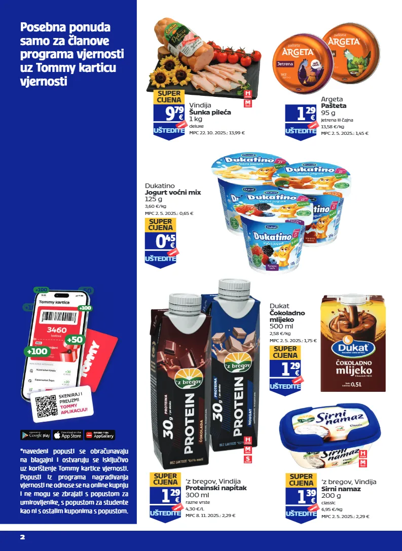 posebna ponuda samo za članove programa vjernosti uz tommy karticu vjernosti *navedeni popusti se obračunavaju na blagajni i ostvaruju se isključivo uz korištenje tommy kartice vjernosti. popusti iz programa nagrađivanja vjernosti ne odnose se na online kupnju i ne mogu se zbrajati s popustom za umirovljenike, s popustom za studente kao ni s ostalim kuponima s popustom. +50 +100 +100 +50 +100 +100 2 dukatino jogurt voćni mix 125 g 3,60 €/kg mpc 2. 5. 2025.: 0,65 € uštedite super cijena 0 45 dukat čokoladno mlijeko 500 ml 2,58 €/kg mpc 2. 5. 2025.: 1,75 € uštedite super cijena 1 29 ‘z bregov, vindija sirni namaz 200 g classic 6,95 €/kg mpc 2. 5. 2025.: 2,29 € uštedite super cijena 1 39 vindija šunka pileća 1 kg deluxe mpc 22. 10. 2025.: 13,99 € uštedite super cijena 9 79 argeta pašteta 95 g jetrena ili čajna 13,58 €/kg mpc 2. 5. 2025.: 1,45 € uštedite 1 29 ‘z bregov, vindija proteinski napitak 300 ml razne vrste 4,30 €/l mpc 8. 11. 2025.: 2,29 € uštedite super cijena 1 29