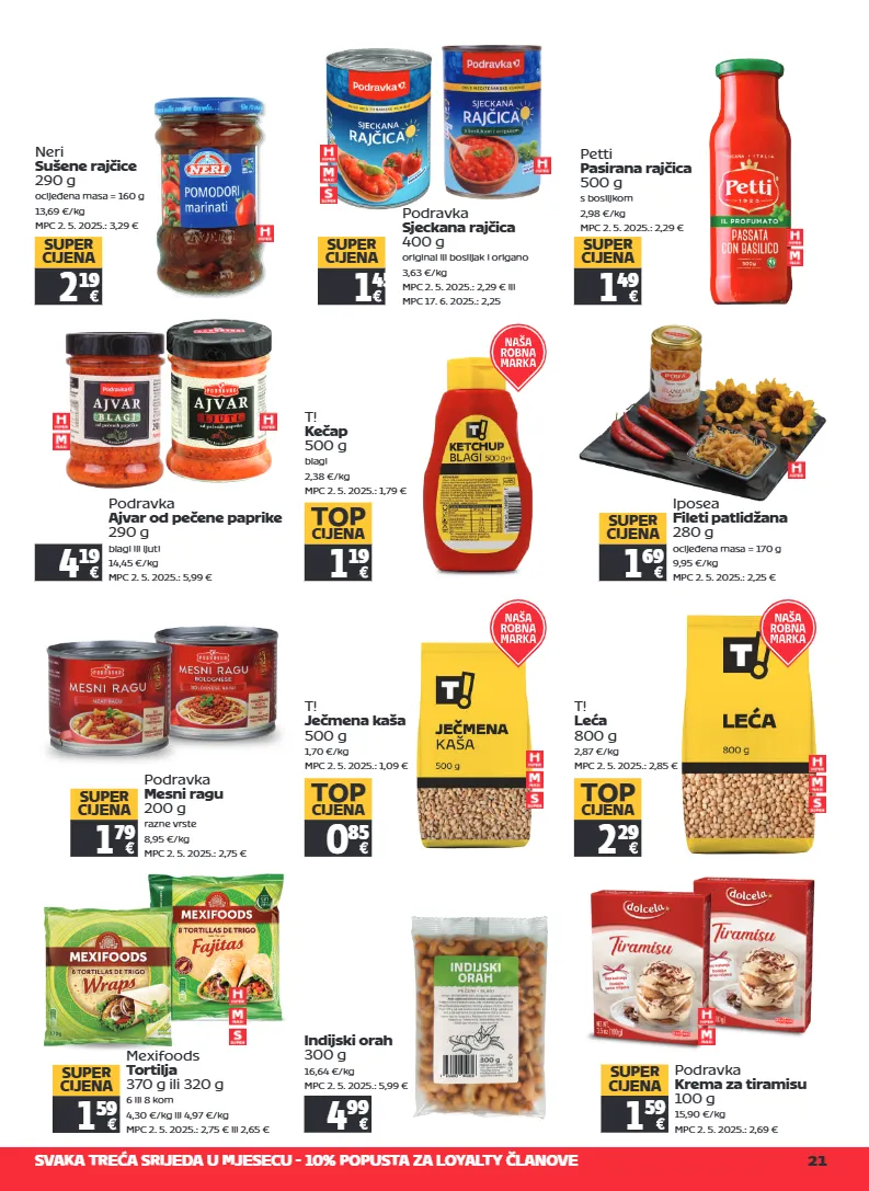 21 svaka tre1a srijeda u mjesecu ž 10% popusta za loyalty -lanove 21 neri sušene rajčice 290 g ocijeđena masa = 160 g 13,69 €/kg mpc 2. 5. 2025.: 3,29 € 2 19 super cijena podravka sjeckana rajčica 400 g original ili bosiljak i origano 3,63 €/kg mpc 2. 5. 2025.: 2,29 € ili mpc 17. 6. 2025.: 2,25 1 45 super cijena petti pasirana rajčica 500 g s bosiljkom 2,98 €/kg mpc 2. 5. 2025.: 2,29 € 1 49 super cijena podravka ajvar od pečene paprike 290 g blagi ili ljuti 14,45 €/kg mpc 2. 5. 2025.: 5,99 € 4 19 t! kečap 500 g blagi 2,38 €/kg mpc 2. 5. 2025.: 1,79 € 1 19 top cijena iposea fileti patlidžana 280 g ocijeđena masa = 170 g 9,95 €/kg mpc 2. 5. 2025.: 2,25 € 1 69 super cijena podravka mesni ragu 200 g razne vrste 8,95 €/kg mpc 2. 5. 2025.: 2,75 € 1 79 super cijena indijski orah 300 g 16,64 €/kg mpc 2. 5. 2025.: 5,99 € 4 99 t! ječmena kaša 500 g 1,70 €/kg mpc 2. 5. 2025.: 1,09 € 0 85 top cijena t! leća 800 g 2,87 €/kg mpc 2. 5. 2025.: 2,85 € 2 29 top cijena podravka krema za tiramisu 100 g 15,90 €/kg mpc 2. 5. 2025.: 2,69 € 1 59 super cijena 1 59 super cijena mexifoods tortilja 370 g ili 320 g 6 ili 8 kom 4,30 €/kg ili 4,97 €/kg mpc 2. 5. 2025.: 2,75 € ili 2,65 €