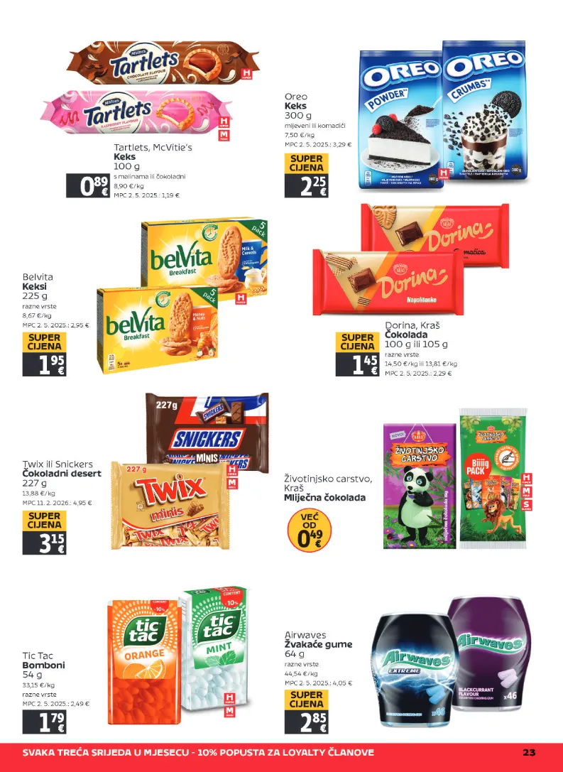 4 79 € hruskavci 280 g 17,11 €/kg mpc 2.5. 2025.: 4,39 € husarski poljupci 280 g 17,11 €/kg mpc 2.5. 2025.: 4,39 € 4 79 € 4 69 € mandulat 150 g 31,27 €/kg mpc 2.5. 2025.: 3,99 € mandulat 90 g 33,23 €/kg mpc 2.5.2025.: 2,69 € 2 99 € 22 ponuda vrijedi od četvrtka 9. 4. 2026. do srijede 15. 4. 2026. kraš čajni kolutići 800 g original ili kakao 3,69 €/kg mpc 2. 5. 2025.: 4,29 € 2 95 super cijena medeno srce, pionir keks -25% * tart, banini keks 210 g razne vrste 5,67 €/kg mpc 2. 5. 2025.: 1,69 € 1 19 super cijena moto, kraš čajno pecivo 192 g kakao ili kakao i mlijeko 7,77 €/kg mpc 2. 5. 2025.: 1,99 € 1 49 super cijena