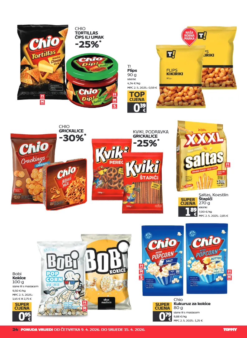 24 ponuda vrijedi od četvrtka 9. 4. 2026. do srijede 15. 4. 2026. chio tortillas čips ili umak -25% * t! flips 90 g kikiriki 4,34 €/kg mpc 2. 5. 2025.: 0,59 € 0 39 top cijena chio grickalice -30% * kviki, podravka grickalice -25% * bobi kokice 100 g slane ili s maslacem 9,50 €/kg mpc 2. 5. 2025.: 1,45 € ili 2,75 € 0 95 super cijena chio kukuruz za kokice 80 g slane ili s maslacem 9,88 €/kg mpc 2. 5. 2025.: 1,25 € 0 79 super cijena saltas, koestlin štapići 270 g kikiriki 7,00 €/kg mpc 2. 5. 2025.: 2,85 € 1 89 super cijena