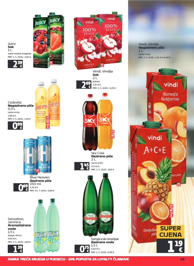 svaka treća srijeda u mjesecu - 10% popusta za loyalty članove 25 2 69 0 75 vindi, vindija negazirano piće 1 l razne vrste mpc 2. 5. 2025.: 1,35 € ili 1,69 € 1 19 super cijena juicy sok 1 l super bobice ili jagoda mpc 2. 5. 2025.: 3,05 € 2 39 vindi, vindija sok 2 l jabuka 1,35 €/l mpc 2. 5. 2025.: 3,29 € cedevita negazirano piće 0,5 l razne vrste 1,98 €/l mpc 2. 5. 2025.: 1,29 € 0 99 sky cola gazirano piće 2 l razne vrste 0,73 €/l mpc 2. 5. 2025.: 1,99 € 1 45 blue heaven gazirano piće 250 ml 2,76 €/l mpc 25. 7. 2025.: 0,89 € 0 69 sensation, jamnica aromatizirana voda 1,5 l bazga i limun 0,93 €/l mpc 2. 5. 2025.: 1,89 € 1 39 sarajevski kiseljak gazirana voda 1,5 l 0,50 €/l mpc 2. 5. 2025.: 0,99 €