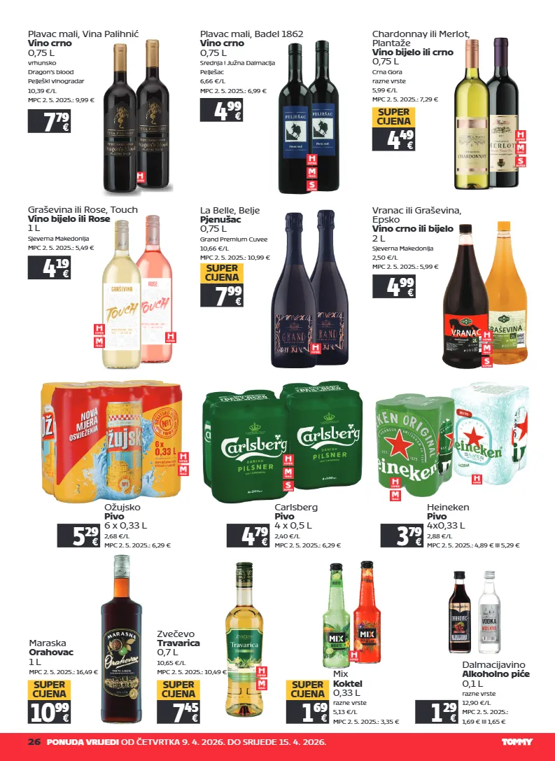 26 ponuda vrijedi od četvrtka 9. 4. 2026. do srijede 15. 4. 2026. la belle, belje pjenušac 0,75 l grand premium cuvee 10,66 €/l mpc 2. 5. 2025.: 10,99 € 7 99 super cijena vranac ili graševina, epsko vino crno ili bijelo 2 l sjeverna makedonija 2,50 €/l mpc 2. 5. 2025.: 5,99 € 4 99 carlsberg pivo 4 x 0,5 l 2,40 €/l mpc 2. 5. 2025.: 6,29 € 4 79 heineken pivo 4x0,33 l 2,88 €/l mpc 2. 5. 2025.: 4,89 € ili 5,29 € 3 79 maraska orahovac 1 l mpc 2. 5. 2025.: 16,49 € 10 99 super cijena zvečevo travarica 0,7 l 10,65 €/l mpc 2. 5. 2025.: 10,49 € 7 45 super cijena dalmacijavino alkoholno piće 0,1 l razne vrste 12,90 €/l mpc 2. 5. 2025.: 1,69 € ili 1,65 € 1 29 mix koktel 0,33 l razne vrste 5,13 €/l mpc 2. 5. 2025.: 3,35 € 1 69 super cijena plavac mali, vina palihnić vino crno 0,75 l vrhunsko dragon’s blood pelješki vinogradar 10,39 €/l mpc 2. 5. 2025.: 9,99 € 7 79 plavac mali, badel 1862 vino crno 0,75 l srednja i južna dalmacija pelješac 6,66 €/l mpc 2. 5. 2025.: 6,99 € 4 99 chardonnay ili merlot, plantaže vino bijelo ili crno 0,75 l crna gora razne vrste 5,99 €/l mpc 2. 5. 2025.: 7,29 € 4 49 super cijena graševina ili rose, touch vino bijelo ili rose 1 l sjeverna makedonija mpc 2. 5. 2025.: 5,49 € 4 19 ožujsko pivo 6 x 0,33 l 2,68 €/l mpc 2. 5. 2025.: 6,29 € 5 29