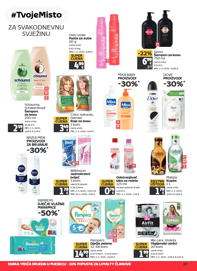 svaka treća srijeda u mjesecu - 10% popusta za loyalty članove 27 za svakodnevnu svježinu 6 99 8 99 -22% syoss šampon za kosu 750 ml razne vrste 9,32 €/l mpc 2. 5. 2025.: 11,99 € mixa baby proizvodi -30% * dove proizvodi -30% * nivea men proizvodi za brijanje -30% * wilkinson jednokratni brijač 5 kom sword ili beauty 0,36 €/kom mpc 2. 5. 2025.: 3,29 € ili mpc 19. 3. 2026.: 2,95 € 1 79 super cijena color naturals, garnier boja za kosu 1 kom razne vrste mpc 2. 5. 2025.: 5,49 € 3 49 super cijena odstranjivač laka za nokte 125 ml na bazi acetona ili uljni 6,32 €/l mpc 2. 5. 2025.: 1,19 € 0 79 super cijena 1 79 ekstra ušteda malizia kupka 1 l razne vrste mpc 2. 5. 2025.: 3,29 € ili 3,69 € pampers dječje vlažne maramice -50% * pampers dječje pelene 32-68 kom razne vrste 0,47 €/kom - 0,23 €/kom mpc 2. 5. 2025.: 22,49 € 14 99 super cijena 1 99 super cijena we care, violeta higijenski ulošci 20 kom razne vrste 0,10 €/kom mpc 2. 5. 2025.: 2,69 € ili 2,65 € helo smile pasta za zube 60 g razne vrste 83,17 €/kg mpc 7. 6. 2025.: 6,99 € 4 99 super cijena schauma, schwarzkopf šampon za kosu 250 ml razne vrste 10,36 €/l mpc 2. 5. 2025.: 2,89 € ili 3,29 € 2 59