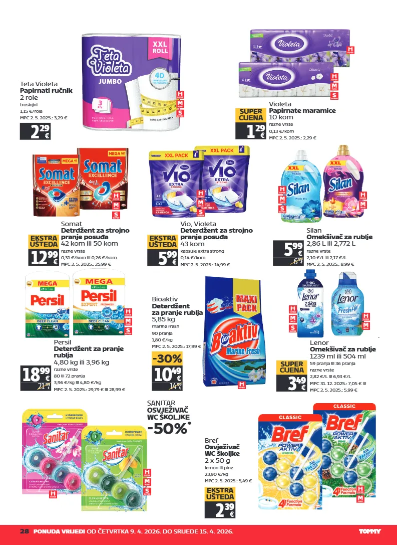28 ponuda vrijedi od četvrtka 9. 4. 2026. do srijede 15. 4. 2026. violeta papirnate maramice 10 kom razne vrste 0,13 €/kom mpc 2. 5. 2025.: 2,29 € 1 29 super cijena sanitar osvježivač wc školjke -50% * bref osvježivač wc školjke 2 x 50 g lemon ili pine 23,90 €/kg mpc 2. 5. 2025.: 5,49 € 2 39 ekstra ušteda teta violeta papirnati ručnik 2 role troslojni 1,15 €/rola mpc 2. 5. 2025.: 3,29 € 2 29 12 99 ekstra ušteda 10 49 14 99 -30% bioaktiv deterdžent za pranje rublja 5,85 kg marine fresh 90 pranja 1,80 €/kg mpc 2. 5. 2025.: 17,99 € 5 99 6 99 silan omekšivač za rublje 2,86 l ili 2,772 l razne vrste 2,10 €/l ili 2,17 €/l mpc 2. 5. 2025.: 8,99 € vio, violeta deterdžent za strojno pranje posuđa 43 kom kapsule extra strong 0,14 €/kom mpc 2. 5. 2025.: 14,99 € 5 99 ekstra ušteda somat detrdžent za strojno pranje posuđa 42 kom ili 50 kom razne vrste 0,31 €/kom ili 0,26 €/kom mpc 2. 5. 2025.: 25,99 € 18 99 21 99 persil deterdžent za pranje rublja 4,80 kg ili 3,96 kg razne vrste 80 ili 72 pranja 3,96 €/kg ili 4,80 €/kg mpc 2. 5. 2025.: 29,79 € ili 28,99 € 3 49 super cijena lenor omekšivač za rublje 1239 ml ili 504 ml 59 pranja ili 36 pranja razne vrste 2,82 €/l ili 6,93 €/l mpc 31. 12. 2025.: 7,05 € ili mpc 2. 5. 2025.: 5,99 €