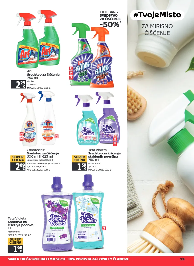 ZA MIRISNO ČIŠĆENJE SVAKA TREmA SRIJEDA U MJESECU a 10% POPUSTA ZA LOYALTY xLANOVE 29 Arf Sredstvo za čišćenje 750 ml deobad 3,06 €/L MPC 2. 5. 2025.: 3,05 € 2 29 CILIT BANG SREDSTVO ZA ČIŠĆENJE -50% * Chanteclair Sredstvo za čišćenje 600 ml ili 625 ml univerzalni odmaščivać ili sredstvo za uklanjanje kamenca 4,82 €/L ili 4,63 €/L MPC 2. 5. 2025.: 4,29 € 2 89 SUPER CIJENA Teta Violeta Sredstvo za čišćenje staklenih površina 750 ml razne vrste 2,12 €/L MPC 2. 5. 2025.: 2,49 € 1 59 SUPER CIJENA 1 69 SUPER CIJENA Teta Violeta Sredstvo za čišćenje podova 1 L razne vrste MPC 2. 5. 2025.: 3,29 €