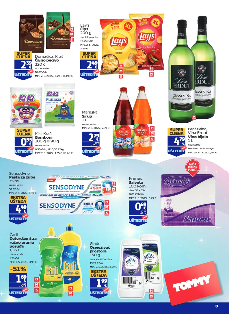 3 domaćica, kraš čajno pecivo 220 g razne vrste 10,87 €/kg mpc 2. 5. 2025.: 3,49 € ili 3,99 € uštedite super cijena 2 39 kiki, kraš bomboni 100 g ili 90 g razne vrste 9,50 €/kg ili 10,56 €/kg mpc 2. 5. 2025.: 1,35 € ili 1,45 € uštedite super cijena 0 95 lay’s čips 200 g slani ili paprika 12,45 €/kg mpc 2. 5. 2025.: 3,29 € uštedite super cijena 2 49 uštedite super cijena 4 79 graševina, vina erdut vino bijelo 1 l kvalitetno hrvatsko podunavlje mpc 15. 8. 2025.: 7,05 € 0 79 uštedite 0 69 primax salvete 100 kom dim: 33 x 33 cm 0,01 €/kom mpc 2. 5. 2025.: 0,79 € 3 49 uštedite 1 69 -51% čarli deterdžent za ručno pranje posuđa 1,35 l razne vrste 1,26 €/l mpc 2. 5. 2025.: 3,99 € sensodyne pasta za zube 75 ml razne vrste 59,87 €/l mpc 2. 5. 2025.: 6,99 € uštedite ekstra ušteda 4 49 glade osvježivač prostora 150 g lavanda ili đurđica 13,27 €/kg mpc 2. 5. 2025.: 3,29 € uštedite ekstra ušteda 1 99 2 99 uštedite 2 79 maraska sirup 1 l razne vrste mpc 2. 5. 2025.: 2,99 €