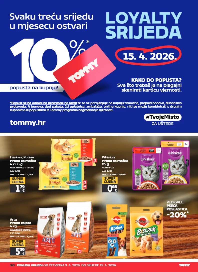 30 ponuda vrijedi od četvrtka 9. 4. 2026. do srijede 15. 4. 2026. friskies, purina hrana za mačke 4 x 85 g losos ili meso u umaku 5,27 €/kg mpc 2. 5. 2025.: 2,69 € 1 79 super cijena whiskas hrana za mačke 85 g razne vrste 7,65 €/kg mpc 2. 5. 2025.: 0,99 € 0 65 super cijena artu hrana za pse 4 kg govedina ili piletina 1,35 €/kg mpc 2. 5. 2025.: 8,29 € 5 39 super cijena pedigree pseća poslastica -20% * popusta na kupnju! svaku treću srijedu u mjesecu ostvari 15. 4. 2026. loyalty srijeda *popust se ne odnosi na proizvode na akciji te se ne primjenjuje na kupnju tiskovina, prepaid bonova, duhanskih proizvoda, a bonova, dpd paketa, 2d uplatnice, ambalažu, online kupnju, niti se može kombinirati s drugim kuponima ili popustima iz tommy programa nagrađivanja vjernosti. kako do popusta? sve što trebaš je na blagajni skenirati karticu vjernosti. tommy.hr *