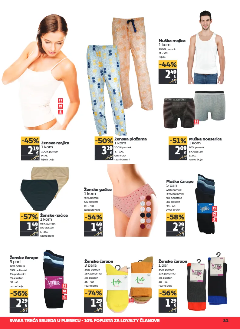 svaka treća srijeda u mjesecu - 10% popusta za loyalty članove 31 2 09 4 29 -51% muške bokserice 1 kom 95% pamuk 5% elastan l-2xl razne boje muške čarape 5 pari 48% pamuk 39% poliamid 9% poliamid 3% elastan 39 - 49 crna ili siva 2 29 5 49 -58% ženske čarape 5 pari 48% pamuk 39% poliamid 9% poliamid 3% elastan 38 - 41 razne boje 2 29 5 31 -56% 1 29 4 99 -74% ženska pidžama 1 kom 100% pamuk s - xxl dojni dio razni dezeni 3 29 6 64 -50% ženske čarape 1 par 80% pamuk 17% poliamid 3% elastan 38 - 41 razne boje 1 29 2 99 -56% ženske gaćice 1 kom 95% pamuk 5% elastan l- 3xl razne boje 1 49 3 49 -57% ženska majica 1 kom 100% pamuk m-xl bijela boja 2 19 3 99 -45% muška majica 1 kom 100% pamuk m - xxl bijela 2 49 4 49 -44% ženske gaćice 1 kom 95% pamuk 5% elastan xl - 3xl razni dezeni 1 49 3 29 -54% ženske čarape 3 para 80% pamuk 18% poliamid 2% elastan 36 - 40 razne boje