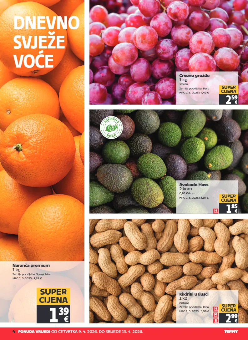 4 ponuda vrijedi od četvrtka 9. 4. 2026. do srijede 15. 4. 2026. dnevno svježe voće naranča premium 1 kg zemlja podrijetla: španjolska mpc 2. 5. 2025.: 1,89 € 1 39 super cijena crveno grožđe 1 kg stolno zemlja podrijetla: peru mpc 2. 5. 2025.: 4,49 € 2 59 super cijena avokado hass 2 kom 0,93 €/kom mpc 2. 5. 2025.: 3,19 € 1 85 super cijena kikiriki u ljusci 1 kg rinfuzo zemlja podrijetla: kina mpc 2. 5. 2025.: 5,09 € 2 99 super cijena v o e