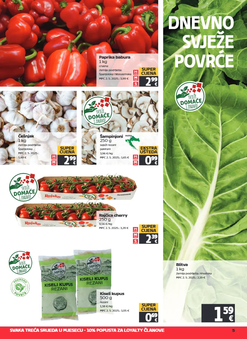 svaka treća srijeda u mjesecu - 10% popusta za loyalty članove 5 dnevno svježe povrće blitva 1 kg zemlja podrijetla: hrvatska mpc 2. 5. 2025.: 2,19 € 1 59 rajčica cherry 250 g 9,56 €/kg mpc 2. 5. 2025.: 3,29 € 2 99 super cijena paprika babura 1 kg crvena zemlja podrijetla: španjolska i nizozemska mpc 2. 5. 2025.: 3,99 € 2 99 super cijena kiseli kupus 500 g rezani 1,38 €/kg mpc 2. 5. 2025.: 1,05 € 0 69 super cijena p o v r e 2 39 super cijena šampinjoni 250 g svježi rezani pakirani 3,96 €/kg mpc 2. 5. 2025.: 1,65 € češnjak 1 kg zemlja podrijetla: španjolska mpc 2. 5. 2025.: 5,49 € 0 99 ekstra ušteda