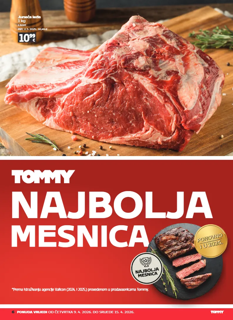 6 PONUDA VRIJEDI OD ČETVRTKA 9. 4. 2026. DO SRIJEDE 15. 4. 2026. Juneća leđa 1 kg s kosti MPC 2. 5. 2025.: 10,49 € 10 99 NAJBOLJA MESNICA *Prema istraživanju agencije Valicon (2024. i 2025.) provedenom u prodavaonicama Tommy.