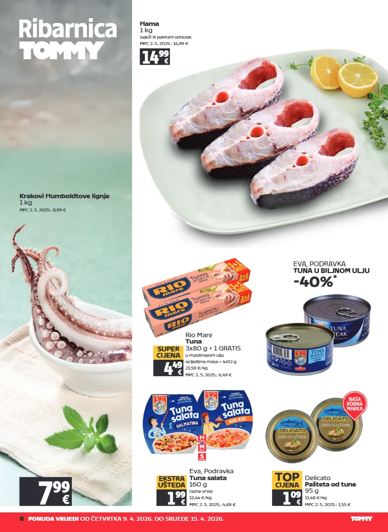 8 ponuda vrijedi od četvrtka 9. 4. 2026. do srijede 15. 4. 2026. ribarnica eva, podravka tuna salata 160 g razne vrste 12,44 €/kg mpc 2. 5. 2025.: 4,69 € 1 99 ekstra ušteda eva, podravka tuna u biljnom ulju -40% * delicato pašteta od tune 95 g 11,48 €/kg mpc 2. 5. 2025.: 1,55 € 1 09 top cijena 14 99 krakovi humboldtove lignje 1 kg mpc 2. 5. 2025.: 8,99 € 7 99 hama 1 kg svježi ili pakirani odrezak mpc 2. 5. 2025.: 14,99 € rio mare tuna 3x80 g + 1 gratis u maslinovom ulju ocijeđena masa = 4x52 g 21,59 €/kg mpc 2. 5. 2025.: 6,49 € 4 49 super cijena